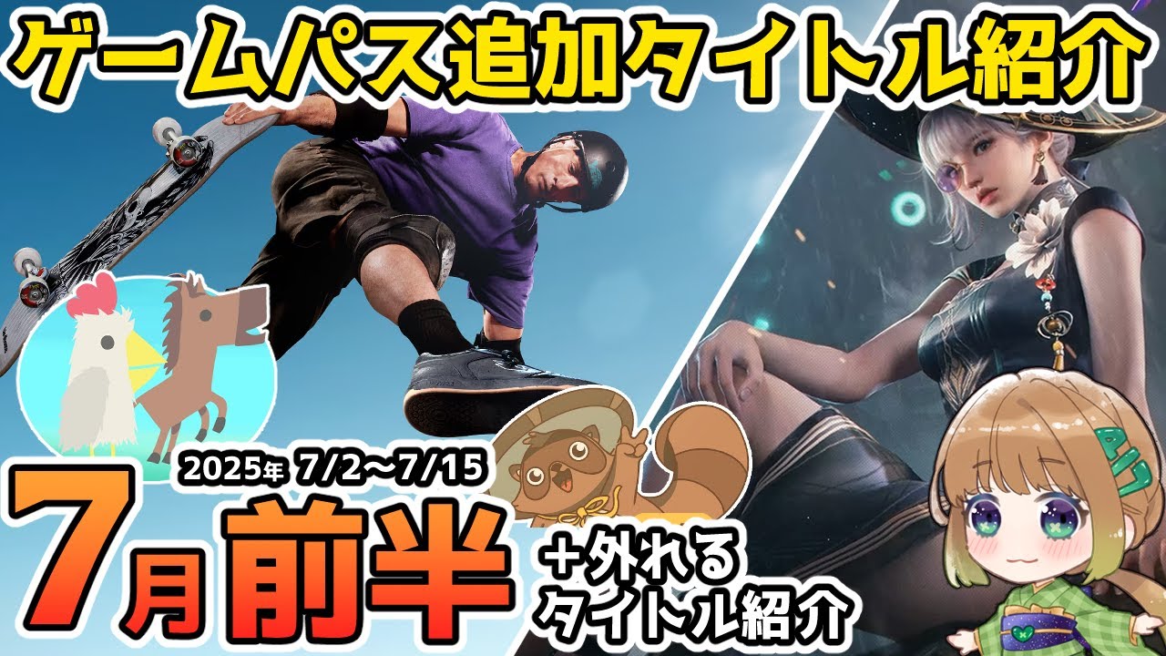 Hello. I’m Takumi Shina, an Xbox-only VTuber. This time, I’ll introduce the tiles that will be added to the Game Pass in the first half of July and the titles that will be removed on July 15th . Please watch until the end. Ultimate Chicken Horse will be compatible with Game Pass from July 3rd . Since it is not a Dewa title, it will also be added to Game Pass Standard . Cute animals compete by setting traps together. A messy party game. This title was released in 2017, but it is still a masterpiece that is very fun and exciting to play. At first, it is a simple course with nothing, but as everyone sets traps, it becomes more and more chaotic, which is interesting . Up to four people can compete locally or online. I personally like this work a lot, so I would be happy if it becomes popular with Game Pass . Ascent will be compatible with Game Pass from July 8th. It is not a single title, so it will also be added to Game Pass Standard. It is a top-down action RPG set in a cyberpunk world. It was removed from Game Pass in July 23 , but it will be added again for the first time in two years. This game can be enjoyed by one person or up to four people in online cooperative play. Come to Minami-dori. Released on July 9th. Game Pass will be available from the first day of release. A casual and laid-back management simulation game set in a Japanese-style world where you can create your own townscape. In this game, you build houses, attract residents to the shopping district, sell products, earn money, and gradually improve the shopping district. It is also possible to select products to sell in the store and procure recipes. In addition to the mission mode where you complete supported goals such as increasing the satisfaction of residents and building specific facilities , there is also a sandbox mode where you can freely create a shopping district. Tanuki is so cute. Sony Hawk Pro Skater 3+4 Released on July 11th . Game Pass will be available from the first day of release. This is a full remake of two games released in 2001 and 2002. This remake reproduces the good points of the original version while adding new skaters, tricks, and new BGM. In addition, two new maps have been added, including a water park set in a drained lazy river . There is also a fulfilling career mode, where you can take on numerous challenges and aim for a high score. By clearing challenges , you can earn in-game money and obtain new items and equipment. It also includes free skating, which allows you to skate freely around the map. In addition, this work supports cross-platform online multiplayer and can be played with up to eight skaters. It is possible to play against each other or freely skate in free skating . By the way, if you purchase the DLC, which will be the Deluxe Edition, you will be able to control Doom Slayer and Revenant, and you will be able to enjoy skating while listening to Dom’s background music. Ion Life will be compatible with Game Pass from July 15th. Since it is not a J1 title, it will also be added to Game Pass Standard. It is an FPS game in which you fight aliens with comical talking guns. It was removed from Game Pass in June last year, but it will be added again. It is a title that sells combat using cute-looking guns and cautious action, but unfortunately it is not available in Japanese. However, since it is a highly polished work throughout , I would like those who are okay with English to play it to the end. Mecha Break will be available from July 2nd. It is a mecha action game in which you pilot sci-fi mechas and fight in a future world. This work is a free-to-play tile , but Game Pass Ultimate subscribers can get special benefits for this work . Here are the benefits you can get. Costumes and skins designed with an Xbox motif . In addition to 3 vs. 3 and 6 vs. 6 online battles, Mecha Break also allows you to enjoy PVPVE mode, so if you like high-speed mecha action games, why not give it a try? And this is not information about Game Pass, but it has been decided that the Xbox 360 Perfect Catalog will be released. It will be released on July 28th at a low price of 2750 yen. This is not a game software, but a book of the big number. It will be a catalog version that includes the Xbox 360 hardware, the domestic distribution version package, and the titles of Xbox Love Arcade . The original Xbox Perfect Catalog was released last year as well . This Perfect Catalog series has been published for various hardware, and I occasionally reread it for the GameCube and Game Boy Advance and feel very nostalgic. If you are a 360 user from that time, you can read it while looking back on the past when you played this work , and even if you don’t know that time , you can look back on the 360 and see that this period was popular . For the domestic packaged version of the 360, it started in 2005 and the last one was Is of the Tor Raider and Black Os 3 in 2015. I’m looking forward to seeing about 10 years of history together, and I’m also grateful that the Live Arcade works will be included . I personally like this book as a game resource, so I’m very happy that the 360 catalog will be published this time . I will attach the Amazon product page in the description of the video , so if you are interested, please check it out. From here, we will introduce the titles that will be removed from Game Pass on July 15th. It will end 11 months after the addition of Mafia Definitive Edition . It is a full remake of the first Mafia game released in 2020 . Unlike modern open world games, where you can enjoy a huge number of detour elements , you basically travel to your destination by car, events and battles occur, and then travel again to enjoy the main story. The volume of the main story is quite low, so if you’re interested, why not give it a try? It took me 10 hours to complete the game. It was completed one year and one month after the addition of the Palist Protocol . This is a survival horror game cr