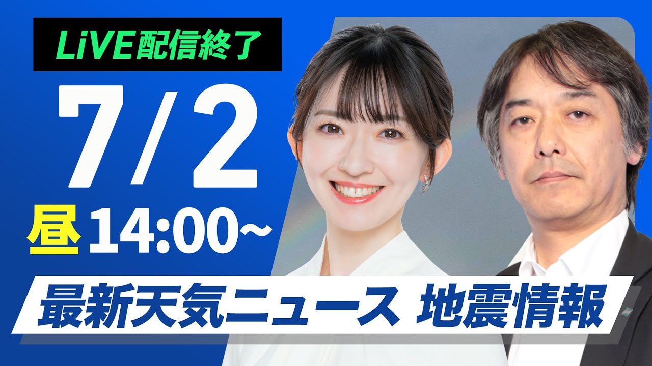 鹿児島トカラ列島近海 震度5弱の地震【ライブ配信終了】最新天気ニュース・地震情報 2025年7月2日(水)/〈ウェザーニュースLiVEアフタヌーン・江川清音/宇野沢達也〉