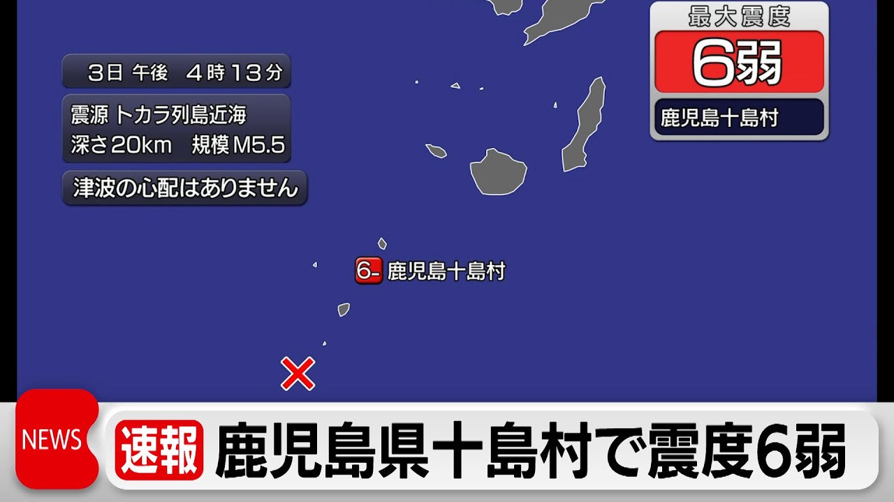 気象庁によりますと先ほど鹿児島県十島村で震度6弱の地震がありました。この地震による津波の心配はありません。気象庁によりますと午後4時13分ごろ、トカラ列島近海を震源とする地震があり十島村で震度6弱の揺れを観測しました。震源の深さはおよそ20キロで、地震の規模をあらわすマグニチュードは5.5と推定されます。この地震による津波の心配はありません。十島村では悪石島で震度4の地震が相次いでいて、このあと気象庁が記者会見する予定です。