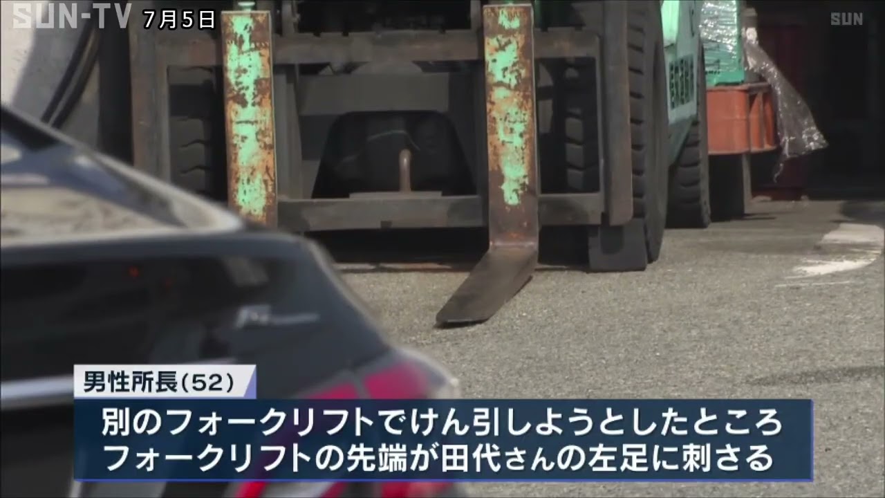 そのため男性所長(52)が、別のフォークリフトでけん引しようとしたところ、フォークリフトの先端が運転席にいた男性の左足に刺さったということです。