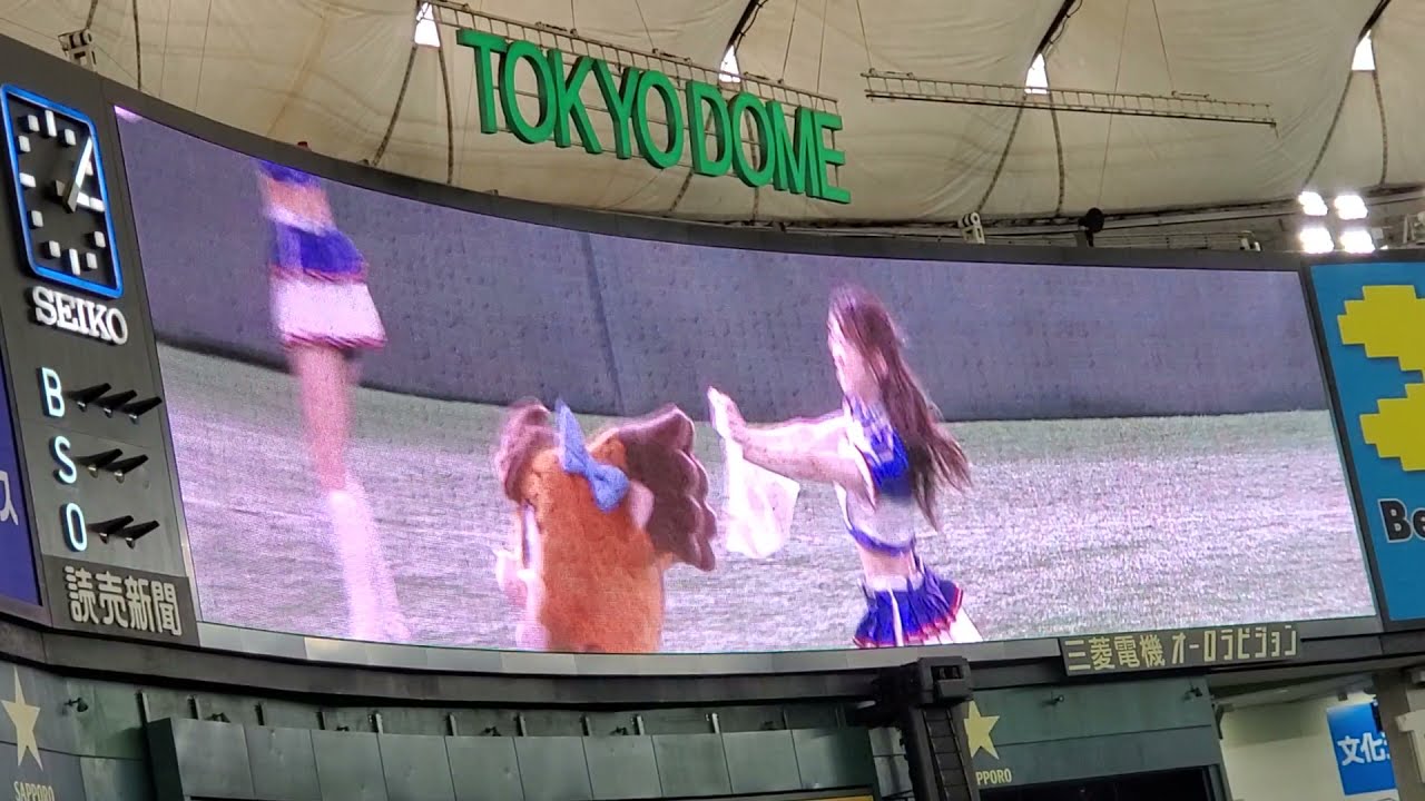 20210418 ファイターズガールとマスコット タオルを使ったダンスパフォーマンス 4回表終了後 北海道日本ハムファイターズ主催試合@東京ドーム・レフト外野