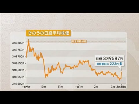 7日の日経平均株価は、3営業日ぶりに反落。4日と比べ、223円安い3万9587円で取引を終えました。