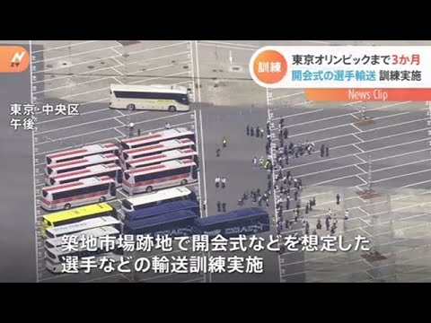集まった30台以上のバスに乗り込んでいくのは、パラリンピックの選手役の職員です。東京オリンピックの開幕まで3か月となった23日、東京・中央区の築地市場跡地で、開会式などを想定し選手などを輸送する訓練が行われました。