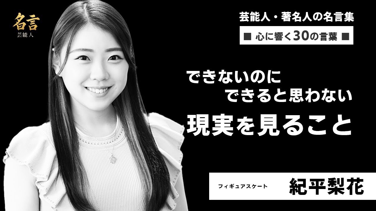 こんにちは。 今回はフィギュア選手の木平さんの心に 響く名言を紹介します。 人生や仕事に役立つヒントが得られるかも しれないので、是非最後までご視聴 ください。 それでは見ていきましょう。 制限1 準備から絶対に完璧に持っていきたい。 名言に 現実を見ること できないのにできると思わないこと 名言さん トリプルアクセルと4回転は全然違ってい て 4回転はうまくいけばどんどんその調子 でいけたりするんですけどトリプル アクセルはちょの軸とかで変わってしまう ので4回転もすごい難しいんですけど トリプルアクセルは同じくらい難しいです 。 名言4 微妙な違いを感じ取れるようになったのも トリプルアクセルさんのおかげ。 名言語 何度失敗を重ねてもトリプルアクセルを 飛び続けてきました。 明言6 トリプルアクセルの成功率が上がった要因 は精神面です。自分を理解してきたこと です。 名言7 何でも1番を目指していました。 名8 スケートを始めたのは3歳の時で姉と母と スケート上に行きました。 何度も転んで立ち上がってはまた転んで 名元級 全ての試合を笑顔で終わりたい。 名10 ジャンプの安定感が出ないと演技構成点も 伸びていかない。 明言11 得典を待つ時は願顔だけ。 明言12 演技の前に順位を気にするといつもだめ。 名言13 できるまで何度も何度も繰り返す 明言14 本番前に試合の会場をよく見渡して今から ここで試合しますよと自分に言い聞かせて 氷に立ってる自分をイメージしておくよう にしています。 名言15 試合での心のコツを掴んできた 明言16 朝田魔さんを尊敬しているのはトリプル アクセルを飛び続けたからです。 自分の経験でそれがどれほど大変なことか が分かります。 制限17 ジュニア時代自分には能力がないと 思い込み、すぐに緊張するタイプだと 思い込んでました。 明言18 ライバルに買って嬉しいとかはないです。 自分の演技ができたことが嬉しいです。 名言19 トリプルアクセル才能があって得意だった からすぐに飛べたんじゃないですか? ってよく聞かれるけれど違うんです。 本当に本当に大変ね。すごくたくさんの 経験を積んでやっとここまで来られた ジャンプなんですよ。 名20。 まだまだ私は経験不足です。 もっと色々と経験して完璧に自分はできる と自身がモてるようになりたい。 明言21。 もうずっと遊んでないですね。夏休みも 遊びに行けたのは2日間だけでしたし、 もう記憶にないぐらい遊んでないです。 明言22 何事もチャレンジすることが好きで勇気は ある方だったので難しいことでも自分なら できると言い聞かせながら頑張っている 日々でした。 名23 こういう時に自分が焦ってると飛べないと いう失敗をたくさん経験してこれは絶対に やってはいけないという心の状態が分かっ たのでそうならないようにする。 名言24 振り返ってみると自分に自身を持ってない し自分を信じてもいませんでした。 明言25 どの試合でもうまくこなさなければまた 歯のみな気持ちになると思い知らされて もうあんな気持ちにはなりたくはない。 制限26 諦めずに飛び続けることが非常に困難に なっていったのを自分もやっていて理解 できます。 本当に素晴らしいと思います。 明言27 とにかく今は世界の頂点を目指す。 ただそれだけです。 名言28 練習中の態度が自分への1番の刺激です。 何かにてこずった時でもできるまで何度も 何度も繰り返すその姿から学びました。 制限20 どの大会もしっかり自分の最高の演技をし たいということだけ考えて 名言30 最後の喜びを味わえるための唯一の チャンスはやっぱりスケート いかがでしたか? キラリカさんの名言にはどんな時も前を 向いて自分らしく生きるためのヒントが たくさん詰まっています。 あなたの心に響いた言葉はありましたか? 是非コメント欄で教えてください。 チャンネル登録、高評価もよろしくお願い します。 それではまた次回の動画でお会いし ましょう。