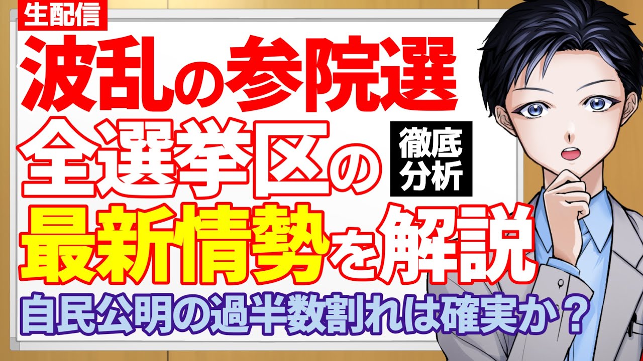 H は は ヘ は は はい、どうもこんばんは。聞こえてます でしょうか? はい。え、新たニュースはあなたの統計 記者VTuberの分野新たです。え、 本日もよろしくお願いいたします。え、と いうことでですね、え、今日は超大型企画 、え、山陰戦全選挙の最新情勢を解説って いうことでね、え、やっていきたいという 風に思いますね。え、こちら注目選曲だけ ではありませんね。激戦区だけでもあり ません。うん。ね、ま、ある意味その テレビのね、ま、ニュースなんかよりも もう長く幅広くそしてね、しっかりと 深掘りしてやっていこうかなっていうね、 え、感じなんですけれども本当にね、ま、 全部の選曲今日はね、え、話していきたい という風に思います。で、ま、山陰戦はね 、皆さんご存知の通り、え、47都道府県 隊員でやっているわけですよ。ま、一部ね 、え、島根鳥取、え、そしてね、え、徳島 高知の方は5億になりますんで、ま、それ でね、え、2つ減って、え、45選挙に なるわけなんですけれども、え、だからね 、え、今回頑張って、え、45個分のね、 え、解説スライド、え、作ってきました。 ま、それをね、これからね、話していき ますんで、え、果たしてね、え、今日の うちに配信が終わるのだろうかっていうね 、感じもあるんですけれども、ま、あの、 私みたいなね、その政治系の ジャーナリストにとっては、ま、選挙って いうのはね、ま、言ってしまえばお祭り みたいなものなんでね。はい。ま、皆さん ね、いろんなものをね、あの、いろんな ことを感じながら選挙ね、え、望んでると いう風に思うんですけれども、ま、 やっぱりね、ある意味すごいあの、盛り上 がるっていうね、タイミング。もうこれで ね、政治そしてね、あの、今後の国の形が 変わるんだっていうね。はい。ま、そう いったものですから、ま、私の方もね、ま 、しっかりとね、こういう風に盛り上げて いきたいなっていう風に思います。という ことでね、ありがとうございますね。この ライブ、え、楽しみにしていましたっての もね、来てますね。え、ということで、え 、今日はね、頑張ってやっていきたいと いう風に思うんですが、え、皆様改めてね 、え、チャンネル登録そして、え、高評価 の方もよろしくお願いします。ま、今日は あれですね、あの、昼にアップしていた 動画の方も結構ね、あの、バズって るっていうかね、あの、再生数回ってい まして、ま、そちらでもね、え、この、え 、ね、全挙、え、解説配信の方をね、あの 、宣伝してましたんで、うん。そっから来 てる人も多いかもしんないですね。うん。 ま、あの、皆さんのね、いろんな、え、ご 意見、ご感想、そして質問などもね、え、 随時受け付けておりますので、是非ね、 そういったものある方はチャット欄の方に もお送りください。 ではですね、えー、選挙区れの解説入って いく前に、ま、まずは はい、こちらですね。え、山陰戦による 議跡数の行方はっていうことで、ま、これ ね、あの、ま、正直、えっと、なんだ、 あの、もう、あの、皆さんね、え、 いろんなニュースで、ま、耳にタコが できるぐらいね、あの、聞いてるという風 に思うんですけれども、ま、ただね、もし かしたら知らない人もいるかもしれない なっていうことで、え、一応念のためね、 え、話しておきたいという風に思います。 ま、今回ね、その自民公明、えーね、参議 院の方で過半数割れするんじゃないかとか ね、ま、言われているわけなんですが、 じゃあ今回の選挙でね、え、何議跡取れば いいんだと。はい。ま、それはね、ズバり 50議跡っていうね、ことになります。え 、参議院のね、え、定数が248で、え、 下半数がね、え、125になりますから。 ま、だからね、え、自民公明で125、え 、持てばね、あの、なんとか事項を下半数 っていうものはね、達成できるわけですよ 。で、ま、3位戦っていうのはね、あの、 半数ずつ3年おきに、え、回線していくと ね、ま、参議院議員の人気は6年なんです けれども、それをね、あの、半分ずつね、 重ね合わせてね、3年ごとに参院戦やって 半分ずつがね、あの、変わっていくって いうね、そういった、え、システムになっ ていますんで、ま、今回もね、その選挙に かけられない、ま、控戦のね、え、議員 さんたちがいるわけですね。で、自民公明 の方では、え、既でにね、え、75議跡 あります。はい。だからこれはね、変わり ませんのでね、今回の選挙関係ありません ので、ま、プラス50ね、え、獲得できれ ばオッケーだよっていうね、え、ことに なります。で、今ね、え、自民は、え、 その回線されるね、え、議跡としては、え 、50に持ってると、そして公明は、え、 14持っていますんで、だから合わせてね 、え、66持ってるわけですね。だ、それ が50まで減っても、ま、ギリね、え、首 の皮1枚繋がるっていうね、話なんですが 、まあね、あの、16減らしても大丈夫 ってことをね、え、考える