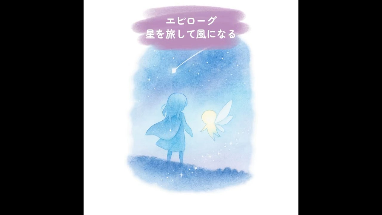 エピローグ星を旅して風になる。 空の森に再び風が吹いた。かつて空とシエルが旅だったあの森。今は少しだけ空が広くのすれ合う音が温かくなっていた。 [音楽] [音楽] 旅の記録は誰の手に触れることもなく速風 の中にしまわれていたけれど巡って帰って きた2人は確かに変わっていた。卵が光っ た日からたくさんの星を巡ってきたね。 シエルが空を見上げながら言った。うん。 涙の降る星も願いを忘れた星も、笑うことを思い出せなかったも、どの星にもきっと誰かの真っすぐな思いが静かに生きていた。 [音楽] 空は自分のマントを握った。その旅の中で出会った思いのかけらたちが優しく包まれている気がした。 [音楽] そうして名前を持たなかった子に名前が宿った。忘れられた記憶が瓶の中で光を放った。 [音楽] 笑うことを思い出せなかった子がくすぐったさに触れた。そして自分の影に怯えていた子が少しだけ光の形を受け入れた。 [音楽] 1 つ1 つの出会いが空とシエルの心の中で静かに火を灯していた。 [音楽] 気づいたんだ。僕たちは星を救ってたんじゃない。その光に僕たちが出会わせてもらってたんだって。 名前を持たなかった子忘れられた願い。 笑うことを思い出せなかった子。そして 自分の影に怯えていた子。その1つ1つが 風のように優しく吹き抜けて、今の空と シエルのあり方をそっと教えてくれた。 そして今誰かがふと顔をあげた時夜空に 優しい風が吹くならそれはきっとどこかで 願いを抱いた誰かがいた証。旅は終わった 。でも終わりじゃなかった。空とシエルの 風は今日も星のさきを探している。それは もう名前を持っている全てのものとまだ 名前をもらっていない全ての願いのために 。 風は今日もどこかで名前を探している。 [音楽]