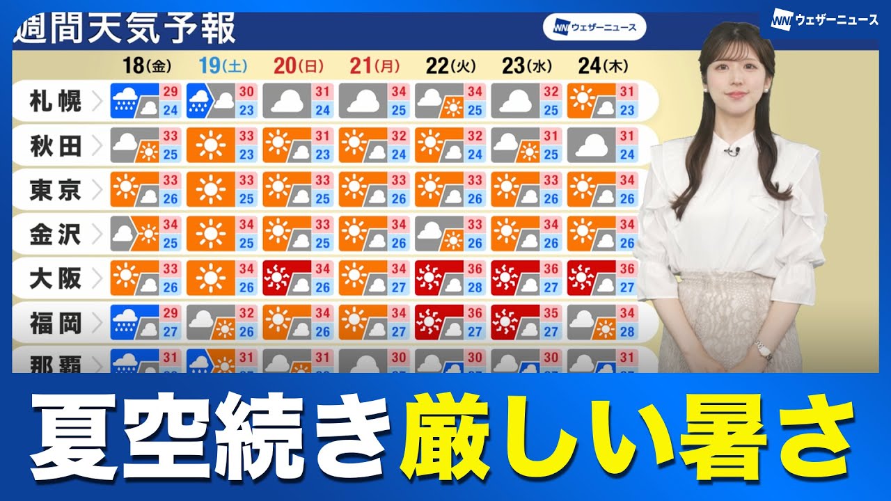 週刊の天気をお伝えします。本州では夏空 が続く1週間となりそうです。西日本では 18日金曜日頃まで雨の強まり大まみに 警戒が必要です。その後3連休ですが本州 付近は広い範囲で晴れて日差しが届く 見込み火曜日以降も晴れて気温の高い傾向 が続きそうです。一方で南性初島では熱帯 低気圧や湿った空気の影響を受けやすく 曇りや雨の日が多くなりそうです。同行 次第では雨が強まったりする可能性もあり ます。特に期間の後半ほど最新の気象情報 にご注意ください。北海道では前線の影響 を受けて期間の前半3連休中も雲が目立っ たり雨が降ったりといった天気です。ただ 気温は高く北日本、石日本にかけて全域で 30°超えの日が続く見込みです。場所に よっては体温並みかそれ衣装の危険な厚さ となるところもあるかもしれません。 引き続き熱中症対策は万全に行い体調管理 もしっかりと行ってください。最新の情報 はウェザーニュースのアプリからもご覧 いただけます。
