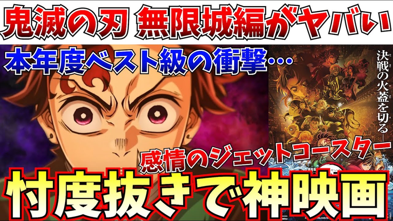 ごめん。これね、冒頭にね、今付け加え てるんだけど、あの、言い忘れてたから 言っとくけど、この絵が普通に本年度 ベスト級です。まず間違いなく国産 アニメーション映像の最高到達点の1つで あろう、凄まじい、もう最高密度の映像で 2時間半殴られ続けるだけでも半端じゃ ないのに、もう単純にドラマ性の部分も 凄まじく美しい。もう美しいのよ。赤座の 物語が特にな、もう他にも美しい物語ある けど、赤座がええ、ほんま。ま、そこは もうこの後の動画で詳しく語っとるから ここでは活愛や。ほんまええもん作って くれたな、ボケが。分離主義勢力の諸君ご 機嫌よ。行かれた動画にようこそ、ここは 地獄だ。さて、今回の日さんはだな。 いよいよ本日公開の鬼滅の刃の新しい映画 。これを先ほど見てきたというところでだ 。これについてこのIQ2.84兆の俺様 が語っていこうと思うぞ。お前ら耳の穴 かじれ。一体全体何がどうなっているのか というとだな。まず初めにだ。鬼滅の刃の 新作映画めちゃめちゃタイトル長いので 割愛するを見てきたんだけれどもマジで今 ゲロ吐きそうなんだよな。最近食事制限し てたんだけど、映画見て興奮してラーメン 食べたら胃がびっくりしたのか。マジで 吐きそうだ。やっぱり人間ってクソだわ。 鬼になった方がいいわな。ま、それは ともかくとして感想を言っていくぞ。今更 説明は不要だとは思うのだが、こいつは 無限列車以来となる鬼滅の刃の完全新作と なる劇場版だ。いよいよ最終決戦に突入 するというところでだ。無限上編を産策で 映画化するといったもので、その第1弾が こいつという寸法なわけだな。いよいよ 物語はクライマックスという具合で日本が 待望していた物語がついに幕を開ける。 うん。いよいよこの日が来たなあ。うう。 マジで忖度なしで正直な感想を俺は言わせ てもらう。本当に面白かったら面白かっ たって言うし、つまらなかったらつまら なかったって言うし、面白いつまらないの 中のグラデーションのどこかだったらそれ はそのように言う。だから本当にこれは心 の底から思ったことを言うんだけどマジで 素晴らしい映画だった。索作だった。 マイナスポイントもあるにはあるので、 それについても言及するんだけれども、 それを差し引いたとしてもプラスが凄まじ すぎてマジで本年度でもクッシュの エンターテイメント対策の出来上がりに なっていた。うん。間違いなく傑作だった な。ま、前提として鬼滅の刃っていうもの を追っていないと意味が分からないんだ けれどもライトな感じで追っていた俺が ここまで胸に刺さったということはマジで 恐るべシとしか言いようがないだろう。ま 、最低限どういう話なのかとか、ここに 至るまでの過程とか、各キャラクターの バックボーンとか最低限の部分は抑えて おかないとさすがにわけが分からない映画 ではあるのだが、ま、そこをちゃんとね、 ライトな感じでもいいので追っていれば 今回めちゃくちゃ楽しめるんじゃないかと 思う。ま、その結果として勢い余って ラーメンを食ってしまい、今ゲロ吐きそう な状態なので、あの、それはちょっと マイナスではあるな。ま、それはいい でしょう。 感想。映画の尺はなんと150分もある。 めちゃくちゃ長いよな。まあ、ハリウッド の対策映画とかではたまにこんぐらいの 朝弱の作品はあるんだけれども、アニメ 映画としてはこれは相当長い上映時間なの ではないかと思われる。うん。そして実際 に、ま、見てみたんだけれども、この長さ 正直そこまで感じない。いや、分かるんだ よ。3時間近く。ま、2時間半だな。2 時間半あるっていうのは分かるんだけれど も、正直ね、もうジェットコースター ムービーすぎてマジでそれを感じさせない ね。うん。その上で上映2時間半っていう のは無駄ではなく、ま、良質な映画3本分 の満足度がしっかりとある。本当にね、1 秒足りとも妥協を感じさせない悪の映像が 続いていって、体感時間はめちゃくちゃ 短いんだけれども、満足度は映画3本分 ぐらいの満足度がね、しっかりと詰まって いたね。うん。なんかカメラが無限状の中 をダイナミックに移動し、ま、戦闘シーン はもう脳が震えるくらいに激しくで ドラマチックなシーンはね、本当にハット するほど美しく描かれていて、まさしくね 、これ最高到達点と言えるであろう 凄まじいアニメーション映像に仕上がって いた。で、それがね、2時間半年全くの 妥協なくずっと続いていくわけよ。うん。 ガスティスリーグのね、スナイダーカット を見えた後みたいな、ま、凄まじい密度と ボリュームの劇場体験を味わえたっていう 感じだったね。うん。最初から最後まで クライマックスっていう言葉がもう ぴったりと2時間半になっていて、もう ずっとね、映像とね、音でね、ぶん殴られ 続けるようなね、衝撃的な体験になってた ね。戦闘シーンではね、もう本当にね、 興奮しすぎて隣にいたおっさんぶん殴り そうになった