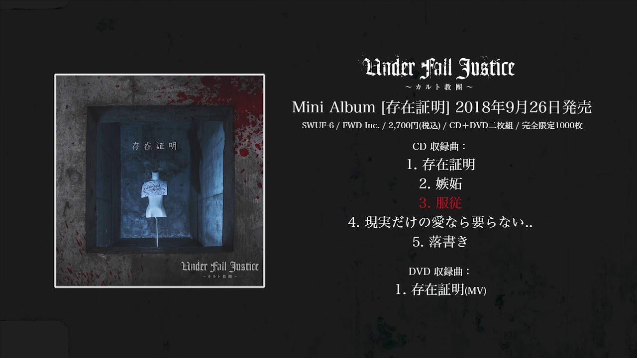 『やっと見つけた存在価値を見失う目は真っ黒です..』まさに『中毒性』という言葉が相応しい世界・宗教感。熱狂的なファンが多い事で知られるUNDER FALL JUSTICEの最新作がついに発売!お待たせしました!元祖名古屋系の再来です。タイトル曲『存在証明』は市川うららFM 感じる🖤ラジオ8月のエンディングテーマ曲!