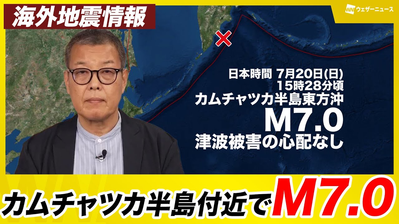日本時間の7月20日(日)15時28分頃、海外で規模の大きな地震がありました。震源地はカムチャツカ半島付近(ロシア、カムチャツカ半島東方沖)で、地震の規模(マグニチュード)は7.0と推定されます。