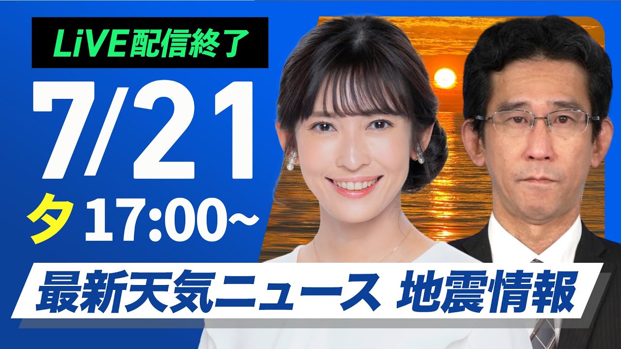 【ライブ配信終了】最新天気ニュース・地震情報 2025年7月21日(月)/長野県で記録的短時間大雨情報 関東甲信の山間部は要注意〈ウェザーニュースLiVEイブニング・山岸 愛梨/山口 剛央〉