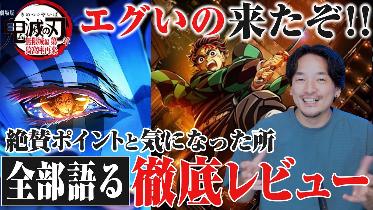 はい、おまけのよです。このチャンネルは 深夜ファミリストークのひらめきテーマの パルチャートークのチャンネルでござい ます。1本でも映画が好きな好きと言って チャンネルでございます。知識のあるなし 上下をつけずに楽しくやっていこうという チャンネルでございます。ということで、 え、鬼滅の刃無限上編赤座最来ネタバレ あり徹底レビュー。 はい、ということで、えー、とんでもない 盛り上がりでね、すごいですね。あの、 これ連休なんすね。いや、すごい。こう 19日にね、公開して、ま、夏休みも 始まると、え、学生もね、え、こっから 夏休みだっていうとこかなと思ったら、 そっからさ、連休もあるから、もう家族 連れファミリーでもうとんでもない工業 収入を上げてますね。え、前作がね、え、 とんでもない大ヒットですけども、それを も超える勢いで今入ってきてるということ でね、え、ま、映画館はね、これでもう大 繁場ですから、もう1年分ぐらいの売上を もう叩き出すんじゃないかなということで 、え、鬼滅にね、頭が上がらないところも ありつつ、え、ま、スーパーマンとかね、 これからファンタスティック4とかもあり ますけども、ま、その映画館の上映問題と かも色々ありますけどもね。はい。ただ、 まあ今回これはお祭りということで、え、 僕もね、え、鬼滅ば初日に見てきて、もう ガンガン喋っていきたいなと思ってますん でよろしくお願いします。はい。でね、 まず僕原作をま、読んでないんですけども 持ってます。買ってあります。だけど、え 、アニメとか映画に合わせて読んでるので 、え、先を知りません。だから今回も、え 、原作読まずに何も知らない状態で、ま、 飛び込んできてですね、ま、レビューも 取りました。で、その上で、えー、こう 16巻から18巻、今回の映画に、え、 相当する部分の本当に映画の終わりの部分 まで呼びました。だから18巻のもう途中 すね。途中のところまで読んで、えー、ま 、これネタバレあり言っちゃいますね。 すいません。もう本当知らない人申し訳 ないですけど、あの、赤座をあの、倒した とこまで読みました。はい。ということで 、あの、どれだけの人がね、まず漫画を 読んでないのかっていう問題もあります からね。え、僕が読んでないからネタバレ ありだがなしだとか言ってますけど、 みんな知ってるわっていうね。ま、大前提 それもあるかもしれないんですけども、ま 、そのまず原作を読んだことない人間とし てのまずレビューとしてね、まず楽しんで いただけたらなという風に思います。はい 。ではまず今回はまず最初に概要も説明し ますけども、え、その後ね、ま、良かった ところ、上がったところとかをね、結構 細かくうわーって作品のね、え、 ストーリーに沿ってぶわって色々喋って いきたいんですが、え、で、その後に、ま 、最後にちょっと気になった部分をね、 少し話したいと思います。はい。で、まあ 、なんで最後はね、ちゃんとあの、忖度 なく僕が思ったこととかもね、言います けども、え、ま、でもね、正直 あの、ま、お祭り映画なんでぶっちゃけ、 ま、このストーリーとかどことかね、ま、 いろんな構成の問題は多少ありますけど、 え、ま、それ以上にね、もうあの、かなり 変わった作品だから、え、まずこの鬼滅の 刃っていうところとしての映画の、ま、 正しさとか面白さがあったのかっていう ところで言うと僕はもう相当すごかったん じゃないかなって思ってるので、え、一方 の映画同向っていうよりはもう秘密の刃の 映像家として、え、まず僕はちょっと色々 ね、興奮したところとか上があの喋って いきたいと思います。 はい。で、まず概要ね、もう本当説明する 必要ないですけどもね。え、前作が 400円超えのね、ま、日本の歴代工業 収入もうナンバーワン、もうね、え、誰も 超えることできないんじゃねっていう ぐらいのレベルのとんでもない圧倒的数字 。ま、そもそもセと千ひの神隠しが、え、 いやこんなん誰が抜けんのっていう数字 だったんだけども、ま、いろんな要素が 重なってですね、ま、運かなり良かったと 思います。あの、時期とかね、ま、コロナ もあったと思いますし、あと時代っていう のもありますね。いろんなこんだけ、え、 みんなの趣味主思考が別れて分断されてい 何々界隈だとか言われてる中でなんかこう 国民的な作品っていうものが、ま、欠除し てるところにこの鬼滅の刃とコロナって いうもことが色々含まれてポロっと入って きた。そしてみんながブわーっと言って ですね、そこに起きたこのエクストリーム がですね、ついにとひを超えるというです ね、え、ま、結構総快な、え、現象だった んじゃないかなという風に思います。もう ね、本当に説明不要だと思いますけれども 、か炭治郎がね、鬼と貸した禰豆子を人間 に戻すための鬼と戦う姿を描くね、ま、 物語ということで、あ、まあ、そんなだっ たなって改めて