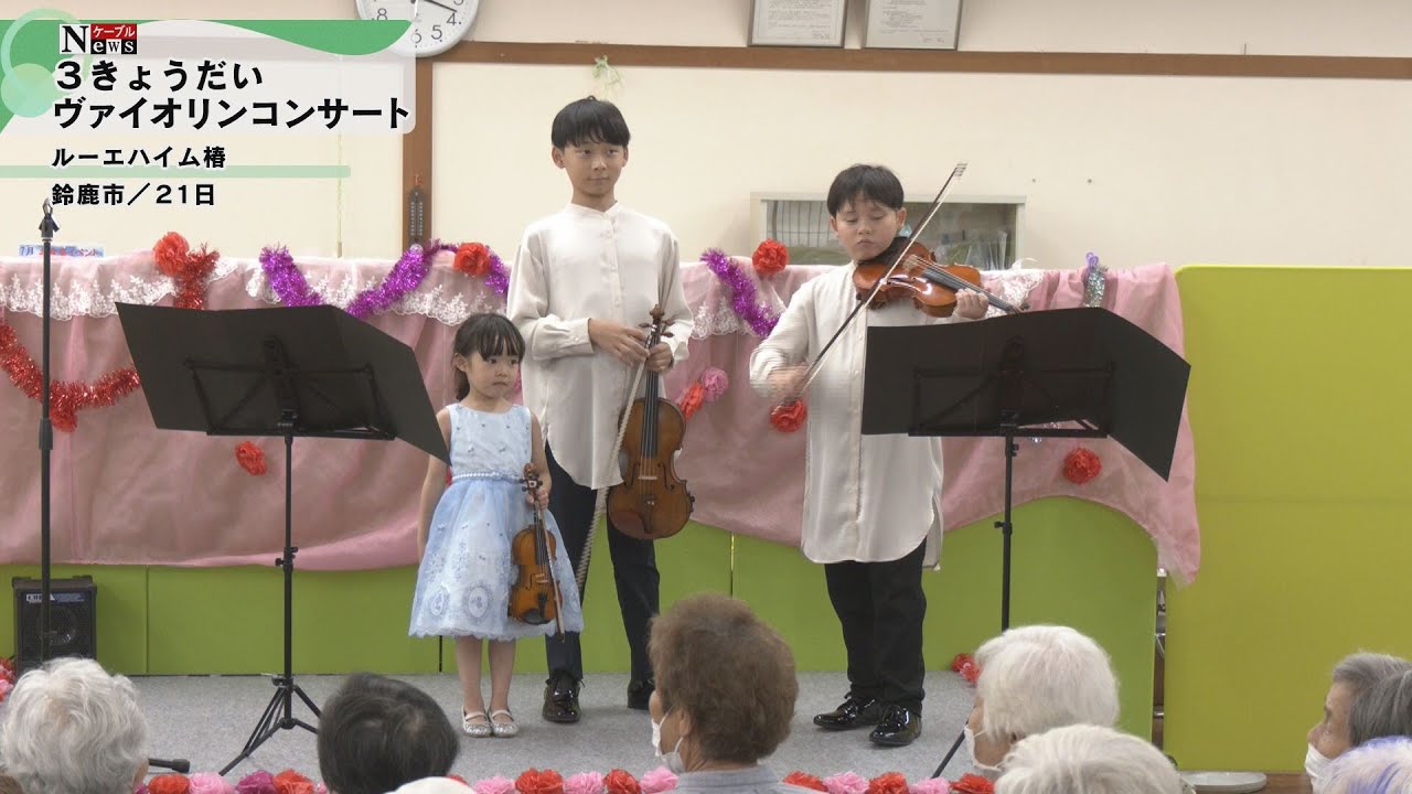 バイオリンコンサートを行ったのは施設を運営する社会福祉法人白会理事長 田中子さんの孫で 愛知県名古屋市在住の近藤さんさん さんの3人です。で、 デイサービスセンタールーエハイムつ木では施設の利用者や地域の人たちに楽しんでもらえるよう毎月様々なイベントを企画していて、今回のコンサートも 2 年前からこの時期に開催しているものです。 2歳からバイオリンを始めたという中学1 年生のルイさんと小学5年生のレンさんは これまで日本演奏化コンクールや三重音楽 コンクールなどで1位を獲得。愛知県や 東京都でコンサート活動も行っています。 また4歳のリリさんは人前で演奏する経験 がまだ少ないということでしたが会場に 美しいネ色を響かせていました。 施設の利用者は年々成長している姿を見る と嬉しい気持ちになります。素晴らしい 演奏で感動しましたと話していました。