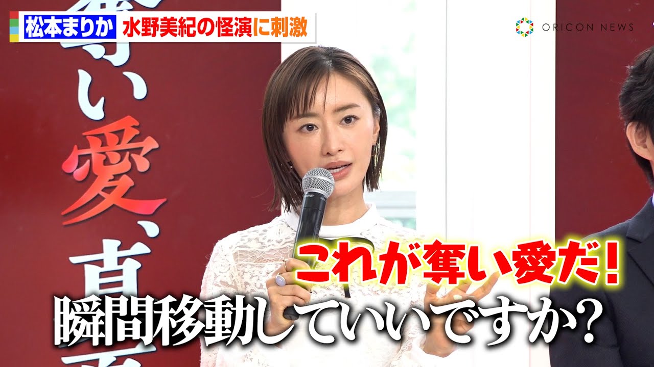 もうプレッシャーです。本当にやっぱり 奪いアイシリーズズっていうのはもうサム さんがあのやられてきてで今回あの引退さ れてでもこのためだけに書かれるという ことでもういろんな意味でもう プレッシャーであの本当に今 ちょっと怖いです。はい。松本さんの セリフから主人公ということで印象的な セリフもたくさんあると思います。不倫は 人を不幸にする。必ずバツを受ける。これ からの私の生き方でこの傷も正解になり ます。夏のマジックにかかったんです。 強のマジックにかかったんですっていう誰も思いつかないような この言うんだっていうこのトリッキーな はい。そうですね。 はい。 バージョンと そうです。はい。 これからの私の生き方でこの傷も正解になりますっていうもう本当になんて言うんですか?もう人間的にすごいこう本質をつくというか夏のマジックにかかったんです。 そうですね。これどうやって言えば あのですね、まさに今おっしゃった通りなんですけど、あのやっぱこうこれからね、私の人生こうドラマの中ですごい大事なことを言うセとやっぱこう僕はやっぱこうテレビでこうドラマをやるからにはこうなんとかして振り向かせたいんですよ。そん時にこう夏用のマジックにかかったんですって言った瞬間に夏用のマジッてみんながつべくかなと思ってこうなんとかして振り向かせたいセリフをで思いついた瞬間にやっぱ笑っちゃうんですよ。 で、だからそのさんもそうですし、あのさんもね、こう皆さんかなり無者なセリフがあることは十々承知してるんです。 そこにこのセリフを言うのに多分かなり悩まれてるであろうということを、え、ち承知してるんですけど、でもなんかこの松本マリカ演じるま鶴の口から言うとなんかこれ言えちゃうんじゃないかっていうのがあってですね。 これはどうやって言えばいいのか分から ないんだけど、これはおさんからのもう メッセージだ。 さんならもうラブレターだって思って、これをどうやって言えるかっていうことをなんかこう楽しむ、頑張るのがこの奪い合いの醍醐み、演じる側の醍醐みであって、 で、こういうセリフが言えたら多分私この作品終わった後めっちゃ演技うまくなるとなってるんじゃないかなって思うぐらい、あの、なんかとっても素敵なハードルをいつもサムさんはくださって、こういうセリ は絶対なくしちゃいけなくって、もうこれをどうやって言えるかっていうのを皆さんにこうこういうあの気持ちの繋がりでこの人言ったんだっていうのを楽しんでいただきたいなっていう ン移ってらっしゃいますが、そしてセラー服姿でいらっしゃる はい、 ま、ま、まずそのセラー服のことを言いますけど、ま、高校制約があるっておさんは私 に、あの、やって 欲しいって言ってくださったみたいなんですけど、ま、各部署から結構あの、やめた方がいいって。あ、結構まずいぞっていう。さすがに まずいぞ。 そう、そう。さすがにそれはまずいんじゃないかって、ま、かなり止められたんですが、 私は おむさんはやれと言ってるんですよね。 私はやりますと言って、あの、ちょっと高校生自体もやらせていただいて、でもおかげで水野さんとこう共演ができて はい。 まあ、水野さんがもう、もう素晴らしくて、もう第 1 世からもう、あ、これが奪い合いだっていう世界観をあの、また感じさせてくれて はい。 面白かったのがいきなり突然ですよ。 も初日の大。あ、私ここであの瞬間移動していいですかっていう提案があの台本にはないんですけど はい。 いや、ここで瞬間移動するのかなり面白いなっていう。 へえ、 本当になんかその自由な発想なんですけれども、奪い合いにとってとても適切な あのお芝居いを出してくださる野さんっていうのは本当に一緒にやってて楽しかったですしごいなと思いました。 そのシーンは今夜1話で見られます。 今夜はございません。 あ、まだなんですね。 これから これはこの後 2話かな?2 話3話以降に まあ水のさんがまた面白い展開になっていくので こちらも いやもう毎週見逃せないです ね。
