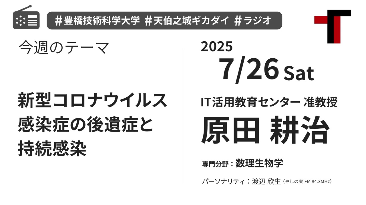[音楽] 君は下科大を知っているか? 世界第1戦の設備を持ち、数々の発見発明 を発表し、研究に成功し、失敗し、 常に200人の科学者が時代を担うアコド と共に喜び苦しみ生きていることを そんな城が天白にはある 天白の城。今日も義下科のすごいを知って 豊橋のことがまた好きになる。 新型コロナ感染は体力ある皆さんからも 大変だったという経験談を聞きます。特に いわゆる行為症に悩まされたと。 豊橋技術科学大学プレゼンツパの白今日は よく分かっていないその行につい て数理的に提案 話題となったIT 活用教育センター準教授原浩司先生 に聞きます。 先生、数理生物学がご専門っていうことですけれども、 これどういうこと? えっとですね、あの、ま、生物現象、様々な生物現象はあると思うんですけれども、そういったものをあの、ま、数学的にモデル化してですね、ま、シュミュレーションすることによってその、えっと、生物現象がどうしてこの世に起こるのかっていうような仕組みの部分を理解していこうっていうようなあの、研究でして、 [音楽] 生物現象っていうのは僕らがお腹減っ とかそういうことですか? あ、そうですね。そういうことも、ま、あの、マクロ的にはそういうことにもなると思うんですけども、ま、今回私がお話しするようなその感染症の例えば仕組みとかっていうのを、ま、どうしてこういう感染症、ま、例えば、ま、感染症何かに感染すると、ま、いろんな症状出てきますけれども、そういった症状がどうして起こるのかみたいなところを数学的に理解できないかっていうところで研究するような分野ですね。うん。 [音楽] [音楽] 病気に感染することが はい。数字で表現できるんですか? ま、今後どういう風にその病情が変化していくのかってことを例えば予測したり 数字になることによって そうですね。はい。 予測が立てられるですね。へえ。 はい。はい。よくあのえっとま、これからお話するその新型コロナウイルス感染症のえっと第覇波とかこう色々こうよくやりました。 第2波とか第3 波とかあれがだからどういう風にしてるが今後あの展開していくのかみたいなことを例えば数理生物学の数理モデルを使って予測するみたいなことは [音楽] できるし、ま、実際あのテレビとかでよくあの予測が流れてましたけどもあれは数理生物学のその知を使って予測を行ってきたっていうことになります。 [音楽] 結構当たるもんなんですか? えっとね、そこがなかなか難しくてですね。 ま、ど、どういう印酒をそのモデルの中にこう組み込むかっていうことによって色々こう予測がこうばらけたりするんですね。うん。あ、どんなパラメーターを盛り込ん?そうですね。あと、ま、モデルの要素としてどういうものをこう盛り込むかみたいなところ。 うん。うん。まさにでも天気予報な感じですよね。 ま、そうですね。はい。そうですね。 あ、じゃあスーパーコンピューターみたいなので、 えっと、ね、それは、ま、あの、そこまでのパワーは必要ないんです。案外、あの、えっと、こういう比較的ね、あの、皆さんが持ってるようなパソコンでね。 うん。 あの、シミレーできたりします。 どういうような先生なんですけれども、今日はそういうお話ですか? はい。 と、今日はですね、あの、ま、新学コロナウイルスの、あの、ま、いわゆる公有症のお話であ、 その公書はどういうメカニズムであの起こってるのかっていうようなところを、ま、仮説の段階ではあるんですけれども、ま、お話できればなという風に思っ [音楽] ね、もう僕の周りもみんな経験して中には 2回目、3 回目っていう人もいて、あ、そうですか。 僕なんかね、あ、お前気づいてないだけで感染したって言われるんですけれど、 特に記憶がないんです。 あ、そうですか。 先生も体験され、 あ、私はね、1回感染してるんですよ。 あ、そうなん。 行意症もみんな結構味がわかんなくなっちゃったとか、匂いがわかんなくなっちゃったとか、 あと咳が長引くとかあいうのですよね。行って。 はい。あ、そうですね。そういうのもあの症状の 1つになると思います。 先生も結構ありました。 えっとね、私はね、もう比較的軽く済んだんです。あ、あの、よく僕ら簡単に行がひどくてとか、行どうだったとか言っちゃうんですけど、そもそも行っていう定義がどういうものなのか [音楽] あ、そうですね。 ちょっと専門の方からちょっと教えていただきたいと思うんですけど、 あ、ま、WHO の定義なんですけれども、ま、コロナがの症状が、ま、出てからですね、あ、 まずは感染しなきゃ行為症はないですね。 そうですね。感染して症状が出てそれから 3 ヶ月後もまだ症状が残ってるっていうのと あと症状が実際 2ヶ月以上続いてる ていうこと あとさらに まの原因でその症状が出てる可能性がないよっていうことが 証明されるとまそれは新型コロナの あそういう定義があるわけなんですね。うん。そんな中で例えば
