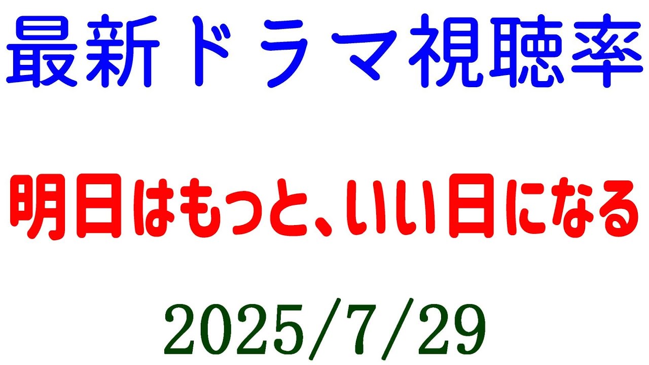 はい。え、視聴率速報です。明日はもっと いい日になるの。第4話が、え、5.7% だったということで、前回と同じですね。 下がることも上がることもなかったと。 そしてですね、え、アンパンのね、85が 17%だったようですね。で、86はまだ 出てない。あと僕たちはまだその星の梗速 を知らないもまだ視張率出てないですけど ね。はい。というこういう結果になりまし たね。明日もっといい日になる。まあ、 5%だよ。え、のまま最終回まるって感じ ですかね。で、僕たちは視聴率出さないの からうん。あんま高くなかったんですかね 。で、本日火曜日で誘拐の日、 スティンガース初コイドドッグスという ことで誘拐の日ね、え、なんと4%台にね 、前回になっちゃったんですけど、今回は どうなるかうん。ですかね。うん。私は見 てますけどね。見てますけども。はい。と いうことでね、うん、今期本当視聴率ね、 え、ね、絶長ですね。ま、ティーバーでは 割と好評なドラマも多いっていうのがある んですけど、やっぱり視聴率は当てになら ないよと、ま、そういう視聴者の方のね、 コメントとかも結構動画コメントにつくん だけど、やっぱりでも視聴率って重要です よね。そもそも視聴率の動画を作ってる わけだから、元もこもない。視聴率なんて 関係ないよ。DVD売れるドラマもあるし 、視聴率低くてもTーバー再生あればいい よって。ま、確かにそういう面はあるけど も、やっぱり視聴率情報は重要ですね。 はい、ということで速報でした。