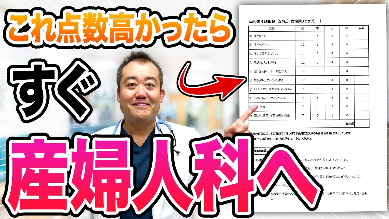 女性ホルモンが出てる場合にはまだ平形で はないよってことになります。このSMI 自己チェック表ってのはあります。後年 期世代の方でも成立が強いとか量が多いと かそういう方はこれ結構ついちゃうのねと いうこともあるので注意が必要です。 皆さんこんにちは。今日もドクター ヨッシーのレディ学のチャンネルをご覧に なっていただき本当にありがとうござい ます。 今日はたけっぴーさんとズッキーニさん来てもらってます。よろしくお願いします。 お願いします。 はい。今日は何を話せばいいですか? 今日はですね、 自分が平形してるかわからないというコメントが結構多いんですけど、今日は平形してるかどうか分かるのかなっていうのをちょっと聞きたいなと思って持ってきしております。 うん。はい。ま、どうやったら分かるかっていう話ですよね。 はい。そう。 なんでじゃそこの話をメインでしていきたいと思うんですけど、結構それを知らない人とか症状だけで話してる人とかそういう人も多いし、じゃ、なんで産婦に行くのみたいなところがあるんで、じゃなんで行かなきゃいけないのかとか、そういうのも含めて、ま、お話をしていきたいと思いますので、是非最後までご覧いただければと思います。どうぞよろしくお願いします。 お願いします。 はい。 [音楽] じゃ、まず平形の基礎的なところ話していきたいと思いますけれども、そもそも平形って何でしたっけ? 平形は整理が 1年間止まること。 そうです。素晴らしい。平形とは何でですかって言うと、 1 年間整理が止まってることを言いますね。実際に止まっていてその 1 年前を見返してあげた時にその時点が平形でしたっていうところになりますね。 そしてその前後5年5年の期間のことを 後年期という風に呼びまして、この後年期 の期間に起こる様々な症状のことを高年期 症状と呼びますと。そしてその症状、ま、 あるんですけど日常生活にも影響を及ぼし てしまうようなことを高年期障害という風 に呼びます。高年期の話をする時に最も 重要なことは何かって言うと、他の病気を 否定してあげるっていうことが何よりも 重要ですね。なのでもうとにかく高年期の 症状ベースだけで動いちゃってる人っての は多いわけですね。もしくは年齢がもう この49とか50だからもう私は後年期 ってもう何も考えずにそうなっちゃってる 人が多いです。もちろん高年機でよく出る 症状っていうのはたくさんあって、それに 当てはまってる人は高年機の症状の可能性 は高いというのは間違いないです。しかし ながらそもそもこの症状の中には他の病気 でも起こってくるような症状のたくさん あります。ま、例えば疲れやすいとかそう いうのはもちろん高年期症状でもあるん ですけど工上線の病気があるとか実は癌が あって体調が悪くて疲れやすいとかそう いうこともあるわけですね。ですから、他 の病気をしっかり否定してあげて、他の 病気じゃないよってことを理解して上で 後年期症状という風に読んで良いという ことになります。例えば同気がするとか こういうのもこう年気症状として認め られることはあるんですけど例えば心臓に 病気があったりしてそれによって同機が出 ちゃってるとかあとは甲状線の病気でも 同機が出たりするのでそういうのかもしれ ないしま目前なんかもこの後年期少女の1 つにはなりますけれどもこれも例えば ジびカの病気があったりとかそれ以外にも 脳に何かできてしまってるそういうので 目前が起きちゃうこともあります。です から先に高年気症状と言ってはいけない よってことになってるので他の病気を しっかり否定してあげるってことが重要 ですしこれあの年気症状だっつってサプリ とか飲んでる人は注意が必要なんで本当に 他の病気も年齢的にも50ぐらいっていう のは誇りやすいですから内にかかって もらったり他の蚊にかかってもらうことは 重要ですからまずそこをしっかり理解して いただくとが根底になります。 そして最も高年期であること、期間症状で あること、ま、平形であることを見極める のはホルモン検査の採決をすることによっ て分かるということになります。そして この最も重要なホルモンでしたっけ? エストロゲン 素晴らしいエストロゲンていう女性でした ね。このどうなったっけ? エストロゲンが上がっちゃう逆ですね。 試されてんのかと思っちゃいましたけどま 、エストロゲンて女性ホルモンは四春期に だんだん上がってきて妊娠出産の時が1番 ピークになります。そして高年期という 時期になると急激に下がってきちゃうん ですね。この下がってしまうことによって 起こるのが高年期症状ということになり ますから、このエストロゲンが下がって くるっていうのが重要になります。対決で エストラジオールというホルモを見てあげ てこれが下がってる場合一般的には28 以下とかって言われてますけれどもそう いうのになってる場合にはいわゆる平形の 値とい