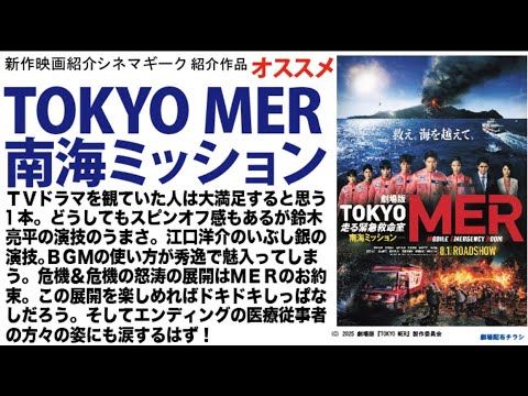 新作映画紹介シネマギークです。え、1 ヶ月ぶりですけども、久々に劇場で見てき ましたシネマシャイン北島で見てきました のは劇場版東京MER走る緊急救名室南海 ミッションということで、え、監督は松本 彩さんという女性監督です。テレビ シリーズの東京Mでも演出でチーフ ディレクターを担当した方ですのでもう 勝って知ったるというところでしょう。 そして脚コ音が黒岩という方です。えー、 キングダムシリーズの方ですので漫画原作 をまとめるのも非常に上手な方だと思い ますし、この劇場版の東京MMRの前作も 手かけられております。そして今年の前半 、え、ヒット作の1つですね、映画版です 。グランメゾンパリーを脚本した方ですの で、ま、非常に脚本力という一点で言うと 非常にまとめが上手な方だと思います。で 、出演は鈴木両平尾各県検党に加えまして 、新しく出てくるのが江口介 メル、宮沢エマというところになっており ます。そしてテレビ版前作でも登場して おります。課条、あ、御コ深夜、ジェシー さ君、フンチあたりももちろん出ており ますし、石代子鶴見信吾も出ております。 で、え、東京MERも言わずとも知れた 作品です。大人気のテレビシリーズの劇場 版の第2弾になっております。ま、オペシ を搭載した大型車両、ERで事故のですと か災害現場に駆けつけて現場で患者の命を 救うために自らあの危険を帰り見ずに戦う 医療を行う都知時直轄の救名医療チームと いうのが東京Mという設定で、え、彼らの 使命はただ1つ死者を1人も出さないこと 。これはテレビ版で何度も言われたところ です。で、ある意味医療体制の究極の理想 の1つとも言える形を見せてくれたのが 東京MERでもありますけども、その続編 映画版のとなりました前作のさらに続編と なります。で、え、タイトルにもある通り と今回は南海ミッション、南の海の ミッションということですけども、え、 北チーフを始めとするメインスタッフは 基本出演しております。で、設定的に東京 M、そして前作の劇場版の横浜MERの 実績からこのMシステムというものが全国 に広がっていて、その流れで鹿児島、沖縄 エリアをカバーする南海MERが試験運用 されているという設定が起きますの。この 辺は、え、オープニングでしっかりと説明 をしてくれます。その南海MERに北道と らが、え、スタッフとして不妊していると いう設定になっております。これだけ抑え ておけばいいのかなとは思います。え、 物語の方ですけども、先ほども言いました けども、2025年これまでの実績が評価 され、全国の主要都市である札幌、仙台、 名古屋、大阪、福岡に新たなMERが誕生 しております。で、一方沖縄鹿児島では 離島地域に対応できるMERの誘致活動が 活発化しを搭載した特殊車両NK1を載せ た船で南の海の島々を巡る南海MERの 試験運用が開始されている中、東京MER のチーフドクターの北そして看護師の夏目 は指導スタッフとして南海MERに不妊し て医療が生き届かない離島医療に従事して いたと。で、そんな中とある南ので突如大 規模な噴火が発生します。溶岩が村を 焼き尽くし合う巨大な噴石が道路や建物を 破壊する中、どうしても風のため ヘリコプターによる上空からの救助は不 可能自衛隊や海場保安の到着は時間を 要する。そんな絶望的な状況的の中、島に 取り残された79名全員の命を救うため、 南海MERは決死のミッションに挑んで いくという風に公式サイトを掲載されて おります。で、え、鈴木両平の演技力のす さっていうのはこの映画でも思う存分感じ られます。え、本当にEドクターをしてる んじゃないかと思わせるほどに緊迫感、 溢れる様々なシーンで刻めチーフを演じ くれて演じきています。まさにヒーローと 言えるところです。あの役者がですね、 役者の顔となる役所ていうのが、ま、そう それぞれ、え、それぞれの役者にあるとは 思うんですけども、ま、例えばあの鈴木 両平の場合だとNetflixのシティ ハンターもそうですけども、そういった、 え、鈴木両平が演チ大学というのは全て 鈴木両平の代表作と言ってもいい。ま、 あの、最近で言うと裁判でもある、あの、 加藤とでもあり、北道チーフでもあると いう、ま、そういった部分の続き両方の 演技力のすごさっていうのは、え、非常に 感じられる部分はありました。で、え、 鈴木両平よりもさらに年上となってきます 江口陽介のイの渋さもが加わり、非常に 見応えがありました。で、患者のための 努力を惜しまず患者第1位をどこまでも 貫く意思としてお医者さんとしてタッグを 組んでくれるっていうのが非常に、え、 このスクリーンでは豪華に見えるというの はありました。で、え、新規メンバー南海 Mの新規メンバーとしての新規出演営の3 人も山用に見場を見せてくれました。え、 高杉マひ君にしても、宮沢エマにしても、 お、メルルにしてもきちんと見場を作り つつシナリオはきちんとまとめてくれると いうところは良かったとは思い