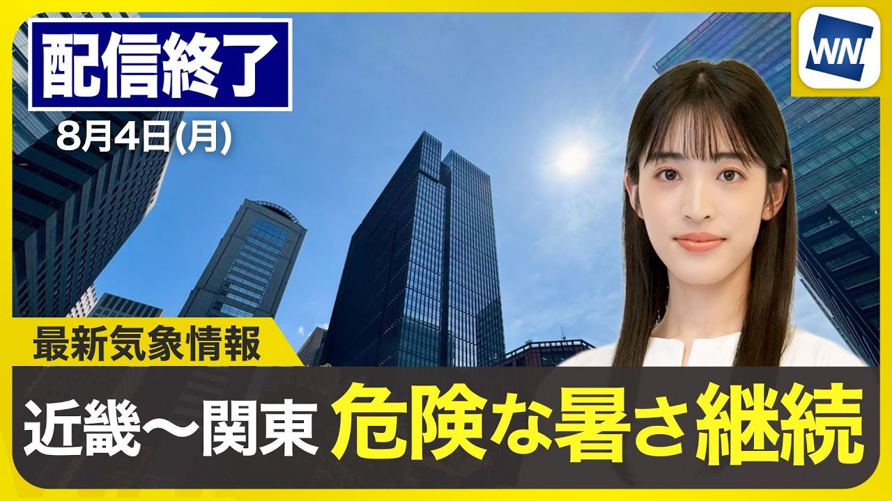 【ライブ配信終了】最新天気ニュース・地震情報 2025年8月4日(月)/近畿から関東で猛暑継続 北日本や九州は天気崩れる〈ウェザーニュースLiVEサンシャイン・松本真央/山口剛央〉