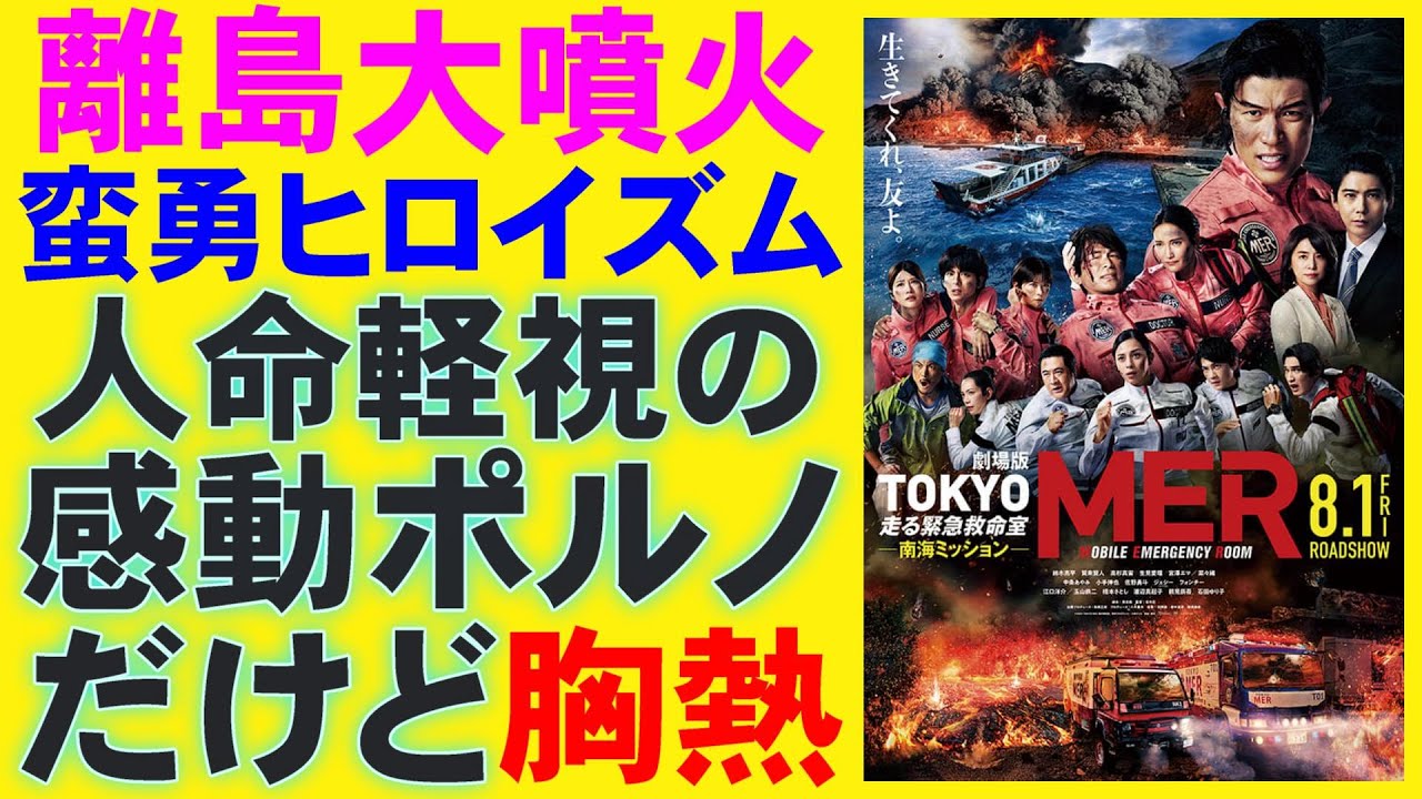 どうも皆さんこんにちは。ミステリー作家 の七尾よです。はい、今日もね、新作映画 1本ご紹介したいと思います。ということ で楽しみにしていた人も多いんじゃない でしょうか。劇場版東京MER走る緊急 救名室南回ミッションっていうことではい 。こちらはね、え、2023年に僕の チャンネルでもレビューしました。劇場版 東京M走る緊急救名室の続編となっており ます。え、元々はね、これTBSの日曜 劇場ドラマなんですよね。レンドラなん ですよ。でも僕はドラマ版は見たことが なくて、え、本作を含めて、え、劇場版 のみの干渉ということになってます。ま、 そんな僕でも、え、この物語全く問題なく 話についていくことができたので、ドラマ 版未町の人でも、え、劇場版は問題なく 楽しむことができるんじゃないかと思い ますよ。なんなら前作、え、前作の劇場版 を見ていなくて、え、本作から見始めたと しても、置いてケりを食らうことはないん じゃないかなと思います。はい。なんで、 ま、ドラマ版も、え、前作の劇場版も見て ないけど、どうしようかなと思ってる方は ですね、まあ大丈夫だと思いますよ。え、 これから見始めても、ま、ま、多少ね、え 、キャラクター関係とか分かりにくい ところは出てくるかもしれませんけども、 ま、正直ね、そんなに困ることはないん じゃないかなと思います。本作は東京 MER発足から、え、通算4年後、劇場版 の前作から2年後という設定になってるん ですね。え、前作の横浜ランドマーク タワー大規模火災から2年後、東京都知事 直轄の救名救急チーム、東京Mの活躍が 世間から評価されて、え、札幌市、仙台市 、名古屋市、大阪市、福岡市にも新たなる MERが発作しているという、ま、そう いう世界戦なんですね。え、MRっていう のはね、え、これは現実には、え、ま、 存在はしておりませんからね。ま、Dマッ に当たるのかな。ま、Dマッはね、民間の お医者さんが集まった集団なんですけど、 ま、こちらね、MERはもうちゃんとした 、え、プロ、プロですよね。 プロフェッショナルの集団なので、これ 公務員扱いになるんですかね?ちょっと よく分かりませんけども、え、その一方で 離島地域である沖縄、鹿児島にも事故や 災害対応のためのMERの誘致活動が活発 化していて、南海MERを指導させるため に東京MERから、え、主人公ドクター、 え、北と、え、彼の右腕的存在でである 看護師の前が派遣されているという、ま、 そういう設定なんですね。要は、ま、東京 Mから、え、今回は南海MERに2人が 派遣されているということになっており ます。で、他のメンバーたちね、東京Mの 他のメンバーたちは、え、東京に残って チーフドクター北美が不在でも頑張ってい ますよみたいな、ま、そんな状況なんです ね。え、前作ではメインを貼っていた メンバーの多くも、え、今回はですね、え 、東京で役脇役的な立ち位置になってるん ですよ。え、その代わり南海Mのチーフ ドクター、え、マシとか、ま、これをね、 え、江口介助さん演じているんですけど、 あと麻酔のたですね。た先生。え、彼女は 、え、宮沢エマさん。金宮沢エマさん、 いろんな映画やドラマでやたらと顔を 見かけますよね。ま、そういった新 キャラクターたちが活躍することとなり ます。 東京Mの活躍が高く評価され、全国主要 都市に新たなMERが誕生する中、沖縄 鹿児島では離島地域に対応できるMERの 誘致活動が活発化しています。え、指導 スタッフとして東京Mのチーフドクター北 と看護師の前が派遣されてオペシ搭載の、 え、中型車両を載せたフェリーでの、え、 離島での事故や災害に対応する南海Mの 使用運用が始まる始まるわけなんですけど も、半年が過ぎても緊急出動要請はなく 廃止寸前に追い込まれていましたってだっ で、災害が起こらなければしょうがないと 思うんだけど、わずか半年でもう廃止が 廃止に決まりかけてるなんてことそんな ことあるんですかね。で、そんなる日 鹿児島県の、え、諏訪島では、え、これ 諏訪之瀬島か諏訪之瀬島では、え、火山が 噴火し、ついに大規模医療事案への出動が 決まります。までは想像をはるかに超える 状況が広がっており、封のため ヘリコプターによる救助ができず、海場 自衛隊や海場保安の到着も数十分後だと 言います。え、噴石が飛び替え溶岩が迫る 中、南海Mは島に取り残された79人の命 を救うべく高難易度のミッションに挑み ますが、バイ映画.comみたいな、え、 内容となっておりました。はい。え、それ ではね、これから詳しくレビューしていく わけなんですけども、その前に映画の評価 額をつけたいと思います。大人の映画干渉 料金2000円を満点としてこの映画に ならいくらまで出せるかということで評価 額をつけたいと思います。映画劇場版東京 M走る緊急救名室南海ミッション評価額は ズり 1500円修作。 えっとね、2023年の、え、前作の評価 額をちょっとチェックしてみたんですけど 、やっぱりね、え、150