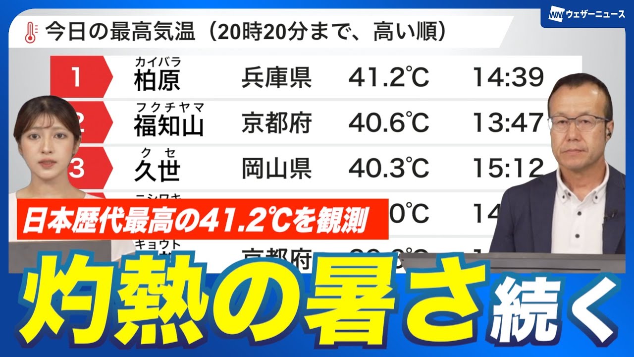 今日は各地で危険な暑さとなりましたが、明日もこの暑さ続きそうですね。 そうですね。はい。え、明日も今日ほどではないにしても、え、やはり相当気温高くなりそうです。 え、今日のね、最高気温おさいしてみましょう。 え、今日は兵庫合県のアメダスカ原で、え、国内観測市場最高の 41.2°午後2時39 分に観測されました。え、これまでは 41.1°が最高で、熊谷ですとか浜松、 え、熊ヶ谷は2018年7月、え、浜松は 2020年8月、え、こちらにね、観測さ れていた41.1°だったんですは、え、 これが今回改めて41.2°まで 上がって記録が更新されたという状況です 。はい。え、このですね、え、ま、猛烈な 厚熱さ、記録的な厚熱さをもたらした要因 、え、ま、上空に非常に温かい空気が入っ ています。太平洋圧の勢力が強く上空の人 流加工流が強くなっていて上空1500m 付近にですね、え、プラ21°以上、 そして今黄色く示した部分なんですが、ま 、これは24°から25°ぐらい、え、と いったような非常に温かい、え、空気の エリアが、ま、形成されました。え、ここ に、え、内陸を中心に非常に強い日車で、 え、気温がぐんぐん上がったといったよう なところが、ま、主な、あ、この気温が 上がった要因ということになります。え、 で、一方で今後明日にかけてなんです けれども、この上空1500m付近の気温 の予想を変化させていきますと、明日は ですね、東日本や、ま、東北の太平洋側 などでは今日よりも少し気温下がる傾向な んですけれども、え、やはり更新東海の ところで見ますと、今日ほどではないにし ても、こちら今日ですね、今日ほどでは ないにしても、明日もやはり、え、この プラス 24°以上の領域というのが形成される見通しです。 はい。 え、このためですね、明日も場所によっては40°前後、え、ま気温が上がっても、え、おかしくないような状況となりそうです。はい。え、こちら明日の午後 [音楽] 2 時の気温予想分布マップでご覧いただきます。 え、特にこれ赤いところはですね、ま、35°以上ということで、明日も、 ええ、東北の日本海側から関東内陸、甲、そして西日本方面などあるんですけれども、紫のところはやはりこれ 40°に達する可能性のあるところ。今日よりは狭くなってますけれどもね、明日も、え、近畿中国地方や九州北部の内陸などを中心に、え、 40度前後になる可能性があります。 え、各エリア主要都市の 気温予想九州方面西から見ていきますとね、え、佐賀でね、39°、熊本で38°、そして、え、中四国エリアでも 38°、え、岡山、高松などでね、予想されております。え、近畿でも京都 38°、鶴ずル 37°、新東海でもですね、 38° 前後と予想されているところがあります。 関東などは今日に比べますと、ま、東京も含めまして、ま、 23 度下がるといったところが多くなりますが、あ、それでも内陸前橋は 36°。 はい。 北日本もですね、日本海側を中心に明日もやはり35°大きく超える予想となっております。今日ほどではないにしても、え、記録的な暑さは明日も続く恐れがあるということで、え、厳重に注意をしていただきたいと思います。 はい。え、明日も各地で体温を上回るよう な危険な暑さとなる予想です。え、屋内 以外問わず1日通して万全の熱中症対策を 行ってお過ごしください。最新の気象情報 はアプリウェザーニュースからもご覧 いただけます。