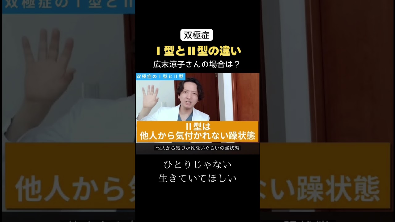 え、1型と2型の違いはどう違うかって いうとですね、程度問題の違いでしかない んですよ。1型の場合は社会機能を損う。 社会機能をですね、制限させ るっていうのがすごく大事です。例えば総 状態のせいで仕事に行けなくなっちゃった だとか、総状態のせいで今までやれてた 価値ができないだとか、総状態のせいで今 まで行けていた学校に行けないだとか、 こういった社会機能に制限がかか るっていうのはすごく大事なんですよね。 ま、こな間だですね、広瀬り子さんがです ね、看護師に暴力をしたっていうことで 捕まってしまったと思います。で、これも ですね、ま、やっぱり彼女はですね、 女優産をされてますので、ま、その女優業 がですね、ま、あの報道を信じて双極性 障害双局症ということであれば、ま、その 女優業ができなくなってしまってる。そう 考えると双局症の位置型なのではないかと 、え、想像できる。これがですね、ま、1 つ例として上げられます。ま、でもこれは ですね、すごいパチなふわっとした表現 でして、もっと苦って言ったらですね、 そう状態が目立たないんですよ。なので、 もうちょっと現実に即して言うと新潟の 場合はですね、他人から気づかれない ぐらいの総状態。ま、これがですね、新潟 の典型的なイメージです。で、1の場合は 広瀬洋子さんみたいですね。ま、誰が見て も事件になってしまう。こういったことが ですね、1の典型なんですよ。じゃあ 近しい人が気づくぐらいの、ま、だけど 会社には行けてる。これくらいはどっちな のかって言うとですね、ま、2型なのか1 型なのかっていうグレーゾーンも当然あり ますけれども、ま、典型例としては苦の 場合は人は気づかない。そして1型の場合 はですね、誰が見ても気づく大事件になっ ちゃうよっていうのがですね、1型なので あります。
