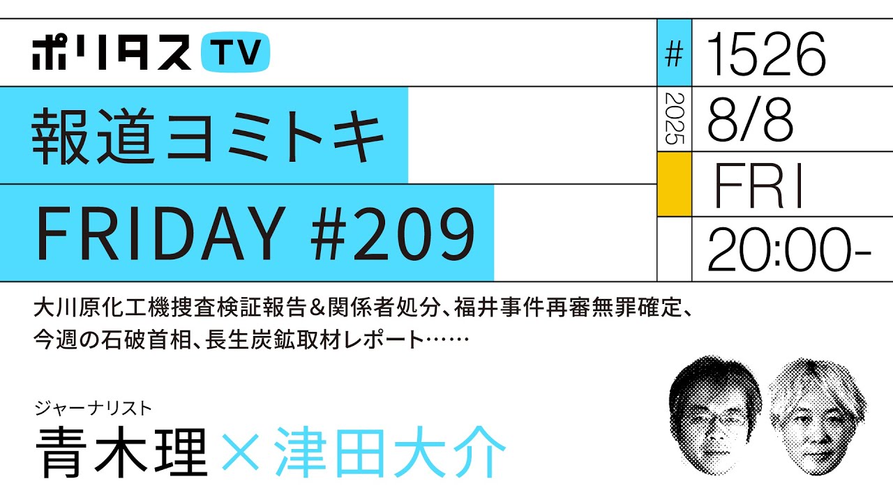 報道ヨミトキFRIDAY #209|大川原化工機捜査検証報告&関係者処分、福井事件再審無罪確定、今週の石破首相、長生炭鉱取材レポート……|ゲスト:青木理(8/8)#ポリタスTV