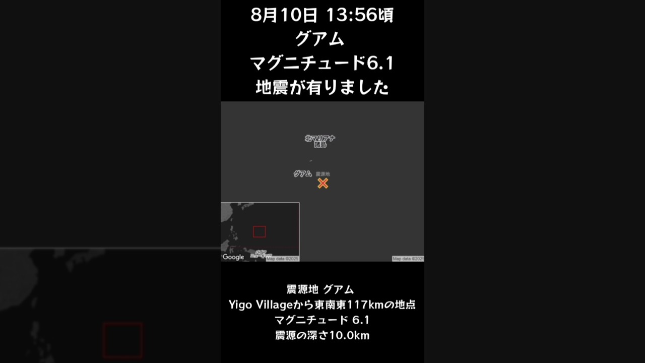 8月10日 13時56分頃 グアムでマグニチュード6.1の地震が有りました 震源地 グアム Vigo Villageから東南東117kmの地点 マグニチュード6.1 震源の深さ10.0km この地震による日本への津波の影響は有りません