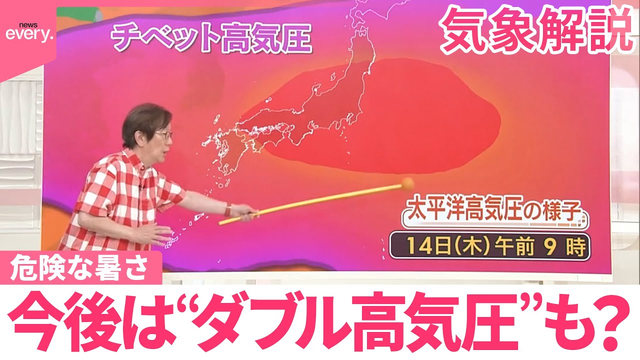 え、私も40 年近く天気を伝えしてきて、こんなは本当に初めてなんです。 そうですね。 はい。で、ま、重複するところもあると思いますけれども はい。 もう一度お伝えします。 はい。 これが今日の午後2 時の気温色で表したものなんですが、どうもこの関東の辺りだけ色の具合が違いますよね。 アップにしてみるとこの紫色以上猛日ということを表してます。中には黒いところもありますね。黒は40°以上ということです。 え、ま、何度もお伝えしてますが、群馬の 椅子先41.8°と、え、いうことでです ね。はい。え、これ国内の歴代の最高更新 してます。その方がもう東京都内やそれ から埼玉県など中心にですね、14地点で 関東、全部関東ですね。 え、これで40°以上。この 1日に14 地点という点数も今までの歴代最高の数なんですね。 そうなんですね。私もさっきあの外行ってみたんですけども、もう熱い空気を押し付けられてる感じで生き苦しさも感じますよね。 はい。そうなんですよ。はい。で、この暑さは明日の日までまだ続きますけど、その後ちょっと変化が出てきます。 あ、そうですか。 はい。雨が予想されてるんですね。はい。 え、これがこの後6 です。もう既でに北海道では、え、大雨になってるとこもありました。 1体も収まってます。 予想見てみるとこれ前線が影響してくるんですね。日本海側や北陸東北などこういったところが雨が降ります。 今まで水不足と言われているところが多かったんで、ある意味災害が起きないくらいに降ってくれるとこれは、ま、恵の雨という捉え方もできますし、ま、雨が降りますから暑も若干収まるということになるんですが、どうもそのままではないようなんですね。はい。 え、言いますのがこれ上空の太平洋用高気圧の勢力範囲なんですが、この太平洋高気圧と夏の地上の厚さ、これはかなりあの相関が良いと言いますか、関連が強いってことは知られています。つまり高気圧が強いと地上も熱いということですね。で、これ今日の状態なんですが、ご覧の通り東北部からずっと南の方はですね、太平高気圧に追われていて、その中心部分、さらに強い部分が関東の近くにあるわけです。 なるほど。 これでもかったわけですが、この後変化が起きます。太平洋高気圧が一旦南に知りきますね。 はい。で、ここ低気圧は前線の通り道になりますから、ここ先ほどの雨なんですね。 で、ま、曇り雨ですから、一旦ここで暑さは、ま、若干柔らぐということが考えられるんですけれども、これで終わりではないんですね。これが 8 日の金曜日。その後また徐々に勢力が強まっていきます。そしてこの太平高気圧なんですが、 あららら。 の頃にかけては今日よりもさらに勢力増し ます。中心付近がどっかりとですね、あの 関東の真ん中にやってくる こういう状態になるんです。これあくまで も今の段階での予想なんですけれどもこう いうことになりますとねあの非常に怖い です。さらにこの上空チベット高気圧がき ます。 ダブル高気圧という猛所の現、あの原因がやってきますんで、再び災害級の危険な暑さがやってくる恐れもありますので、引き続き熱中症対策をしっかりと行ってください。