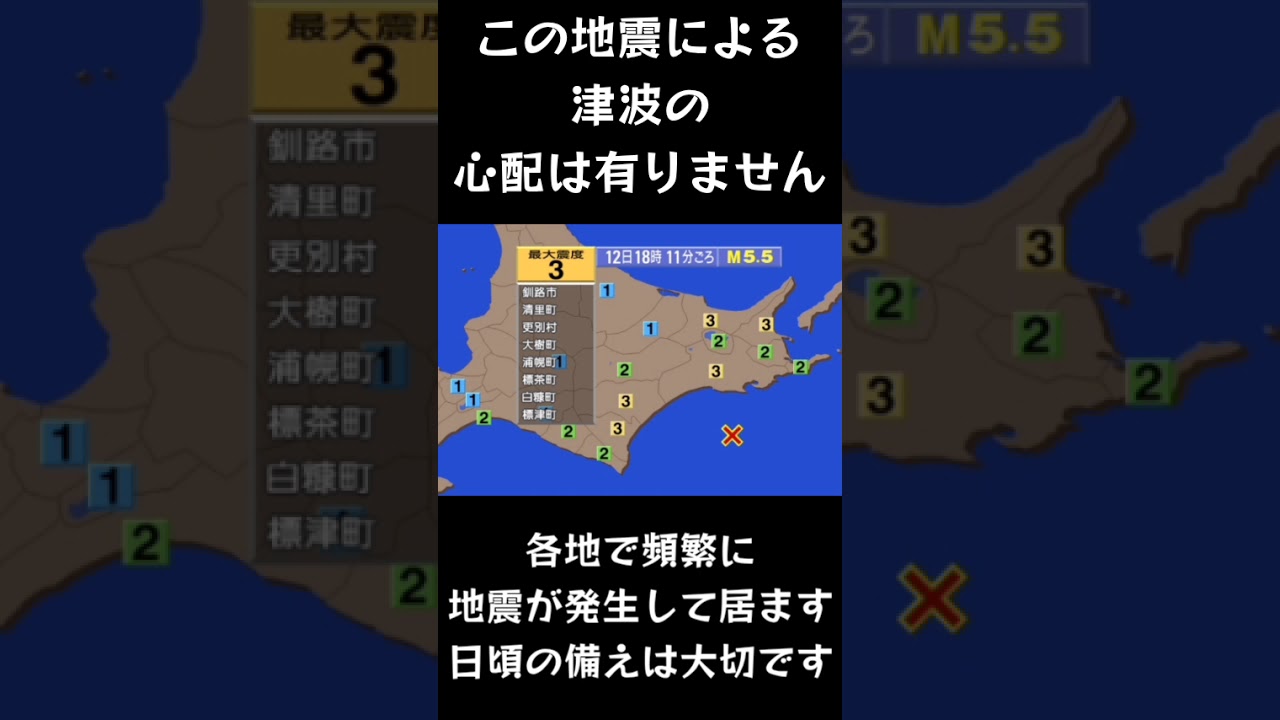 8月12日 18時11分 最大震度3の地震が有りました 震源地 釧路沖 マグニチュード 5.5 震源の深さ 約20km この地震による津波の心配は有りません 各地で頻繁に地震が発生して居ます 日頃の備えは大切です