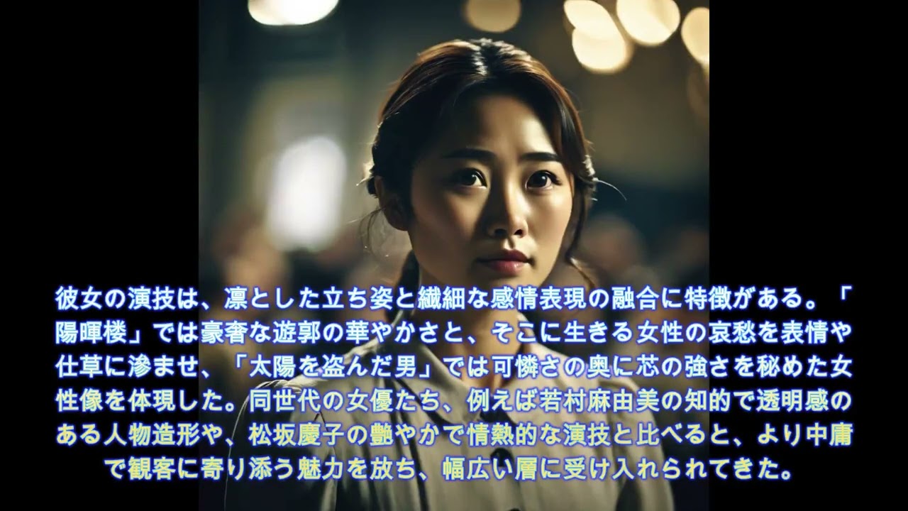 彼女の演技は、凛とした立ち姿と繊細な感情表現の融合に特徴がある。「陽暉楼」では豪奢な遊郭の華やかさと、そこに生きる女性の哀愁を表情や仕草に滲ませ、「太陽を盗んだ男」では可憐さの奥に芯の強さを秘めた女性像を体現した。同世代の女優たち、例えば若村麻由美の知的で透明感のある人物造形や、松坂慶子の艶やかで情熱的な演技と比べると、より中庸で観客に寄り添う魅力を放ち、幅広い層に受け入れられてきた。派手な個性や極端な演出に頼らず、日常の中の感情の揺らぎを丁寧に掬い取る表現力は、彼女の最大の強みである。