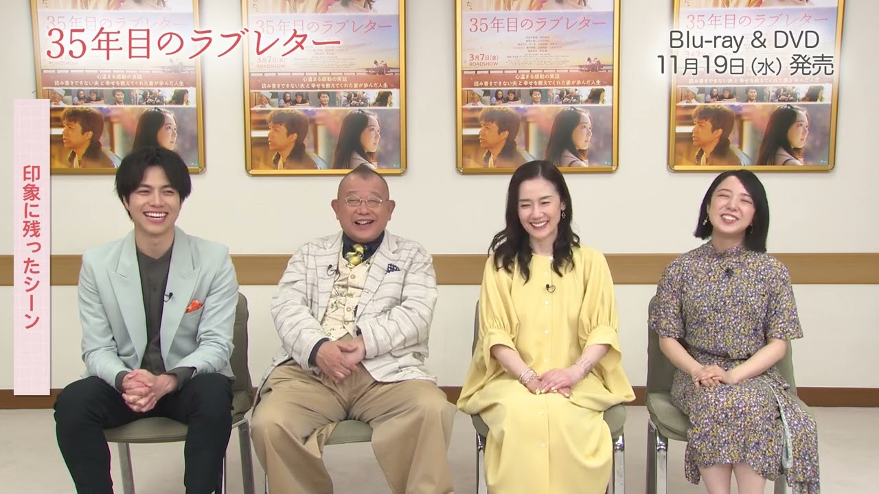 皆さん、こんにちは。小学哲です。 原田智です。 茂岡大駅です。 上白下です。 映画35年目のラフレターのブルーレート DVD が発売されます。え、僕は、え、貧しさゆに文字の読みかきができないまま大人になってしまった西多物を演じます。どんな時もそばに支えてくれた妻がいます。 最愛の妻子へのこれまでの感謝の気持ちをラブレターとして加工とし、定年後の 65 歳から、え、夜間半の中学に帰を始めます。え、そして紛します。 私は多物の妻教を演じ、結婚後はワプロで現稿起こしをして家計を支えて、え、結婚 35年目を迎える。 その日までずっと寄り添いラブレターを 1時また1 時と書いては決を繰り返す向きなさんをそっと見守り続けます。 僕は西田本さんの若りシコを演じて、え、読みかきができないために行きづらい日々を過ごしていましたが、寿司職人として働き始めます。 え、そして子さんと出会い、え、結婚するのですが、読みかきができないことをひにしてて、え、秘密が露したことで別れを覚悟してしまいます。 え、私は多さんの最愛の妻子さんの若師頃を演じました。 戦争で親をなくし、姉に育てられ、タイプ の講師の仕事をしていたおりに運命的に田 さんと出会い、結婚しますが、読みかきが できないことで別れを告げられそうになり ます。ですが、今日から私があなたの手に なるとずっと田さんに寄り添え続けていき ます。うん。言うていいんかな。あの、今 子のままあれが出てくるわけですよ。 ワプロがうんうん。 で、あれ呼んでて、僕信なんですけども本当に急に信じられないようにぐってなったんですよ。それぐらい思い出れがあるっていうのか、その辺を是非感動的なところを見ていただきたいと思いますね。 うん。私もすごくたくさんあるんですけど、でもやっぱ冒頭の 2人のシーンですね、そこはうん。 2人があ、いてらっしゃいっていうことで 、あの、田さんの後ろ姿をずっと見送っ てる京子さんがいて、なんかお互い ちゃんと目を見合わせていつも言葉を大事 な言葉をかけ、書き合うというか、なんか その2人の関係性だったり、それで2人 がんできた人生道り、雨の日も風の日も雪 の日もきっと同じやり取りをなされていた んだなって話を見ただけでもう最初何分か で分かるという あ、素晴らしいと思います。 えっと、僕はやっぱりこう京子さんに自我が書けない、読めないっていうところを、 えっと、言う、伝える、伝えなきゃいけないっていうあのシーンはやっぱりすごくあの、ま、田さんとしても、ま、僕としてもですけど、やっぱりこうなんつうんかすごくやっぱこう力のいるシーンというか、 場面というか、あ、やっぱ今でもやっぱりあの日、あの瞬間を取る時にセ に向かう時の覚悟した気持ちってのがちょっとこう今でもこう思い出す よかったであのシーンはほんまに 私最初に見てて最初に涙が出たシーンがあの鶴べさんが田さんがお家に帰ってあ [音楽] であのき子さんに学校に通って 文字を勉強しようと思うって 告げるシーンが うん とっても好きです あの時のこうちょっと照レ臭そう 田さんの こう佇まいとかそれを聞いた時のき子さんの 喜ぶだ本当にこうぐっときた表情とかあ本当にこのお 2 人はずっと人生を共にしていらしたんだなっていうのがすごく伝わって きてであのお子さんたちも一緒にいるシーン だったのでで私たちはあの 昭和の頃のシーンでちっちゃい子供たちといっぱい撮影したのでああ大きくなったなとか思 で、孫ももうできてるぐらい。 そうですね。 うん。そこは本当いメンバーやったね。 うん。本当 ま、1 から文字を習って最愛の妻へこれまでの感謝を込めてラブレターを描こうとするあのひ向きな夫ですよね。あれがいい。 え、そんな夫の手となり幸せを教えてくれた妻が歩んだ人生。その手紙は精一杯の愛でした。 より添い支え合って生きてきた 35 年の物語はきっといくつになっても挑戦する勇気をもらえるはずです。日常に溢れる優しさ、そして夫婦の支え合う愛情に心がほっこりし、大切な方へありがとうの感謝の気持ちを伝えたくなる映画です。 心は温まる感動の実話を是非ブルーレート DVDでお楽しみください。 はい。 私読みかきできないんですわ。自分の名前もまともに書けないんです。 [音楽] 読みかきができない夫と 他 そばで支え続けた妻。 今日は手がしびれてまして。 お母ちゃんずっと嘘つってたよ。 嘘?見合いですか? 読みかきできんのは言うとらん。会うだけでええから。 嘘ついて申し訳ない気持ちはずっとあったけどずっと一緒にたかったんや。ここはあの勉強教えてくれはるんですか?私にも入りますか? [音楽] 大丈夫。1から教えます。 夜間学級 今更やけど読みかきできるようになりたい。字のことで苦労をかけた嫁班に字でお返ししたいんです。妻にダブレターを描きます。 [音楽] ずっと作りかけろ。ラブソング。 俺と結婚して幸せやったんかなって。けへんの? [音楽] ごめん。俺は