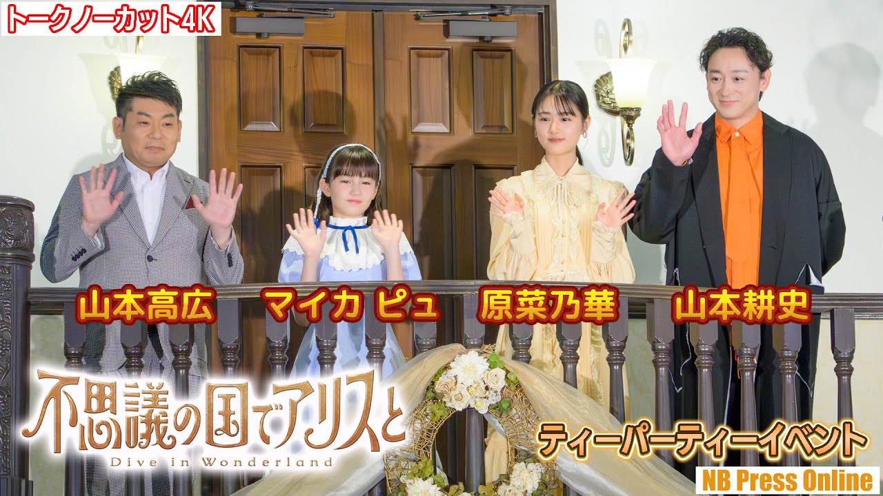 中央からお願いいたします。手を発ただきたいです。 [音楽] キャストの皆様の登場です。盛大の拍手をお願いいたします。 [音楽] [拍手] さ、それでは皆様こちらへお越しください。 [拍手] 不思議の国へ迷い込む主人公の大学生理世役の原さん。不思議の国の住人アリス役のマイカピュさん。 マットハッター役の山本浩司さん、青森役 の山本高弘さんです。今一度大きなをお 願いいたします。 皆様、ようこそTパーティーへお越し くださいました。お客さんも素敵なお 召し物していただいているんですが、皆 さんも素敵なTパーティーにふさわしい 衣装で登場していただきました。という ことで、まずは皆様から一言ずつご挨拶と 本日のファッションポイントを教えて いただければと思います。まずは真面目で 貴帳な性格ながらなかなかうまくいかない 日常に悩む不器用な女子大生あずの理世を 演じられた原さんです。お願いします。 はい。え、本日は暑い中お越しいただき ありがとうございます。あみのリセを演じ ましたなのかです。え、すごいなんか皆 さんとっても素敵なお召し物であの来て くださって本当にありがとうございます。 いつもの舞台挨拶とはちょっと違う感じで すごい楽しみですし、公開まであと2週間 ちょっともっと公開が楽しみになるような 素敵な時間にできたらなと思っています。 短い時間ですがどうぞよろしくお願いし ます。 お願いします。今日はフリルのついた白いワンピースですね。 [拍手] あ、そうです。あ、ファッションポイントだの忘れちゃった。えっと、あの、会場の雰囲気と T パーティーっていうことだったので、ちょっとクラシカルな感じでレースでふわふわさせてみました。はい。でも素敵です。ありがとうございます。 ありがとうございます。 そして変テコリンなウさぎの後を追いかけて不思議の国に入り込んでしまった天身乱漫で好奇心な少女アリスを演じたマイカピさんです。お願いします。 はい、アリス役を演じましたマイカピです。今日はお越しいただきありがとうございます。今日よろしくお願いします。 お願いします。 [拍手] ファッションポイントはあの不思議の国のアリスのまんま出てきたような可愛らしいこのフリフりのついたようなアリスっぽい服を着てるのがポイントだと思います。 ありがとうございます。本当に映像からアリスが飛び出してきたかのような はい。 とっても可愛らしいです。お願いします。 お願いします。 そして風船をつけた気抜服装をしている不思議の国の住人マットハッターを演じた山本浩司さんです。お願いします。 え、ようこそ、え、素敵な T パーティー。そして、え、今日はお招きありがとうございます。 え、ここにある、あの、ま、ちょっと見えるか分かりませんが、マットハッターが割とこうなんかポイントになっているということで、ちょっとそこを意識して、え、今回は今日はちょっとこう、あの、予想を追ってみました。 マットハッター風の衣装ということですね。 そうですね。 なんかちょっとこう普通じゃなくてちょっと奇抜な感じなので、そういった意味でもちょっとこうロングの、え、ま、コートに合わせてこうオレンジをちょっとし伸ばせるという はい。 この会場の雰囲気にもぴったりですね。 そうですね。そうですか。 ぴったりですよ。 うん。あと皆さんもね、すごく素敵だからなんか本当に皆さんでこうなんかゴージャスない時間が過ごせそうで、今日は本当に楽しみです。よろしくお願いします。 よろしくお願いいたします。 続いて不思議の国でインフルエンサーをしている未成虫青ムを演じられた山本高弘さんです。よろしくお願いします。 え、青島役をやりました織田裕二です。あ、違う。あ、青虫役をやりました山本高弘です。え、本日はお盆期間中にも関わらず足を運んでいただきありがとうございます。短い時間ではございますが皆様お付き合いください。よろしくお願いします。 お願いします。 えっと、僕のファッションポイントは特に興味がないと思いますんで進めてください。 いやいや、そんなことないですよね。ちょっと聞きそうですか。 はい。 あ、ちょっとじゃあ、え、ハンプティダンプティを意識して、え、フォルムを、え、ちょっとね、え、体重を増やしてきました。 1 人2役で今日来ていただいた はい。 はい。ありがとうございます。よろしくお願いいたします。 お願いします。 さ、それでは皆さんご着席ただいてここからお話だければと思っております。 失礼します。 そしてスチールの皆様は後ほどフォセッションのお時間設けておりますので、これよりフラッシュをいての撮影は一旦お控えください。さあ、まずはこの映画のイベントには今回初参加ということで山本浩司さんにお伺いできればと思います。 はい。 今回マットハッター役ということですが、オファーをもらった時のお気持ちいいかがでしたか? はい。やっぱりあの皆さん誰もが聞