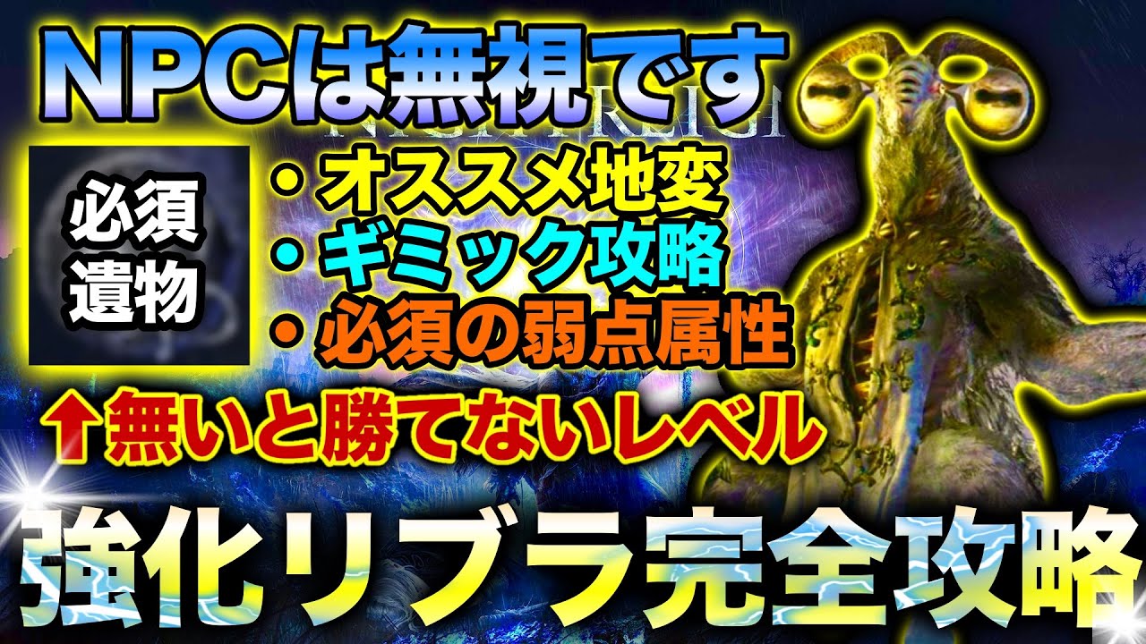 はい、どうも皆さんこんにちは。バメロン です。ということで今回は強化リブラが来 たということでやってきたんですけども、 ま、結構な数を、え、戦いまして、そこで 分かったね、え、攻略法をまとめていき たいと思います。え、まずですね、え、 あいつは召喚してくるんですよ。その在人 。例えば自分ソロでブライ感で言ってるん ですけども、そしたらブライ感が出てくる んですよ。ま、その出てくるって言っても 装備は別。うん。装備はランダムな装備で 出てきて、で、別にそれはいいんですよ。 1人出てきても、ま、倒せるから。でも、 ま、皆様が1番苦戦してるのはね、やはり 2体同時に出てくるとかね、え、なんです けども、そいつらね、無視して戦っていい です。はい。2体になったら無視して戦っ ていいです。ま、どうやって無視すんだっ ていう話なんだけども、それがですね、え 、透明になる。はい。これ一択です。 そもそも レディが強いって言われていて、あの 2 体来たらディのーツ使うといつらがね、同打ち始まるんですよ。で、切れた後もずっと 2 人で戦ってるみたいな。その間にブラとマっていう戦法が強いんですね。ってのを聞いた時に、え、ま、ライカンでもね、ま、どのキャラでもリゴの物を使えば明になれるじゃないですか。はい。 それで2体になったら透明になってリブラ とタイマっていうことを繰り返してたら 比較的楽にね、え、クリアできたので、え 、そのやり方とあとね、ギミックの紹介と か、え、異物の紹介をやっていきたいと 思います。じゃ、まず異物から。1つ目は こちら。え、出撃時の武器に性攻撃力を 負荷。はい。え、リブラですね。一応弱点 10は同じくビということになっているん ですが、なんと、えー、光も弱点です。 あいつどんぐらい弱弱点かって言うと プラス35%。これ持っていかない理由は ないね。なんかカリゴの炎ぐらい効きます 。あいつプラス35%なんでめっちゃ効く ので、え、これを初期武器に装備してで、 ノクラテオでその初期武器を複製して2等 持ちというね、戦法です。はい。で、2つ 目、え、カリゴンのね、イ物ですね。え、 投称状態の発生時姿を消すと投称状態の 対ゼ力攻撃を強化。はい。で、レキの切り なんですけども、ま、一応これ1つで完結 するじゃないですか。これで透明なれる から。ま、強化解放でもどっちもいいんだ けど、ま、自分的にはちょっとね、あの、 道中のファンも含めて、あ、どうせ初期 武器ずっと使うしなので、え、レキの受け より下踏みの方が完全に凍結にさせれるし 、ボス戦でね、かつファームもしやすい ですよね。なので、え、3つ目。はい。 戦技下フ。はい。です。まあね、まあ別に 俺は下使いたいから入れただけだけども、 別に下姫じゃ、下踏みじゃなくても、え、 ま、あの、透明にさせれば何でもいいよっ ていう人は別にこれ入れなくてもいいです 。はい。ということでね、今回はこの3つ でね、やってきました。で、まず1日目で 洞窟でね、この探席2を拾ってもらって、 で、2日目になったら速攻でね、え、 ノクラテオに行きまして、この武器をね、 え、プラス2強化しましょう。 絶対ね、最後まで使うので、ここでね、え 、ない人はね、石買ってで、プラス1+2 とはい、これでオッケーです。はい。で、 やっぱり下踏みるとこういうとこでさ、 めちゃくちゃ強いですね、これ。うん。 ファームが短時間でできるからその分ね、 時間も短縮できると。で、えー、 アステール倒して、 ここで複製です。 はい。これでオッケー。これで完璧 でねえ、ま、装備はこんな感じになりまし た。 結構ね、いい感じかな。レベル15にも なったし、ルーもね、なんか12万余っ てるし。 で、効果が、えー、こんな感じ。 まあまあまあ、物理カットも上がってるし 、回復便の回復量も上がってるし、消費 FP軽減。これもね、あると嬉しい。あと のこの性攻撃力を高めるとか2等持ちの 攻撃力高める。これ拾っといてください。 はい。これ非常に強いんでね。はい。と いうことで結構ね、え、いいのが揃ったの でこれでねやってきました。でも途中 ミスってるんで途中かなりミスってるんで それ解説していきたいと思います。皆様は やらないようにしてください。はい。まず 、え、リブラの選択肢。これはね、うん、 いらないかな。うん。全力で戦いたい以外 はいりません。はい。あと状態以上に強く なりたい。状態以上に強くなりたいと全力 で戦いたいは、え、やった方がいいかも。 はい。で、まず最初はね、普通のルブラと 一緒です。はい。 普通のリブラと一緒。避けて。これも避け て。とにかく殴ると リブラ自身はね、そんなね、強くないので 、ま、もう本当に後半から 怖いのがで、こいつね、第2形態になるの がね、非常に早すぎる。うん。半分とかな のにね、もう本当に早い。もうなるからね 。多分2割削ったらかな。 2割削ったらなるのかな。早すぎて。それ がまあ難しい。このね、リ