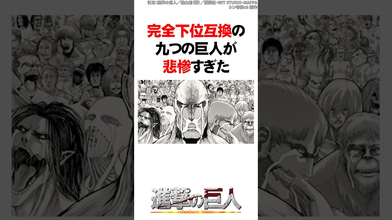 完全下位互換になった九つの巨人が悲惨すぎた【進撃の巨人】 #Shorts今回は完全下位互換になった九つの巨人が悲惨すぎたを解説します!<引用元> 進撃の巨人 (著)諫山創・講談社/「進撃の巨人」The Final Season製作委員会 #進撃の巨人 #shorts animeアニメドラマアニメ進撃の巨人