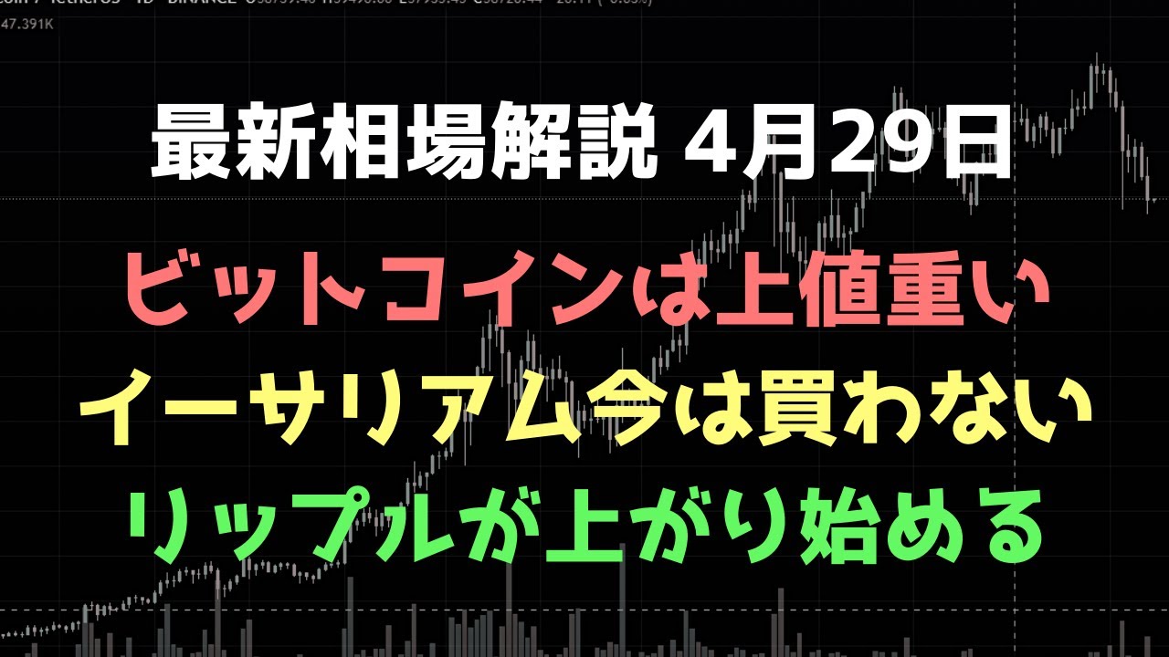 ビットコイン、イーサリアム、リップルの値動きの解説をします。ビットコインは強烈な下落な後なので、下を試しに来ると考えます。イーサリアムが高値更新しましたが自分は引き続き買いません。リップルに強い証があり少しずつ上がり始めると考えます。