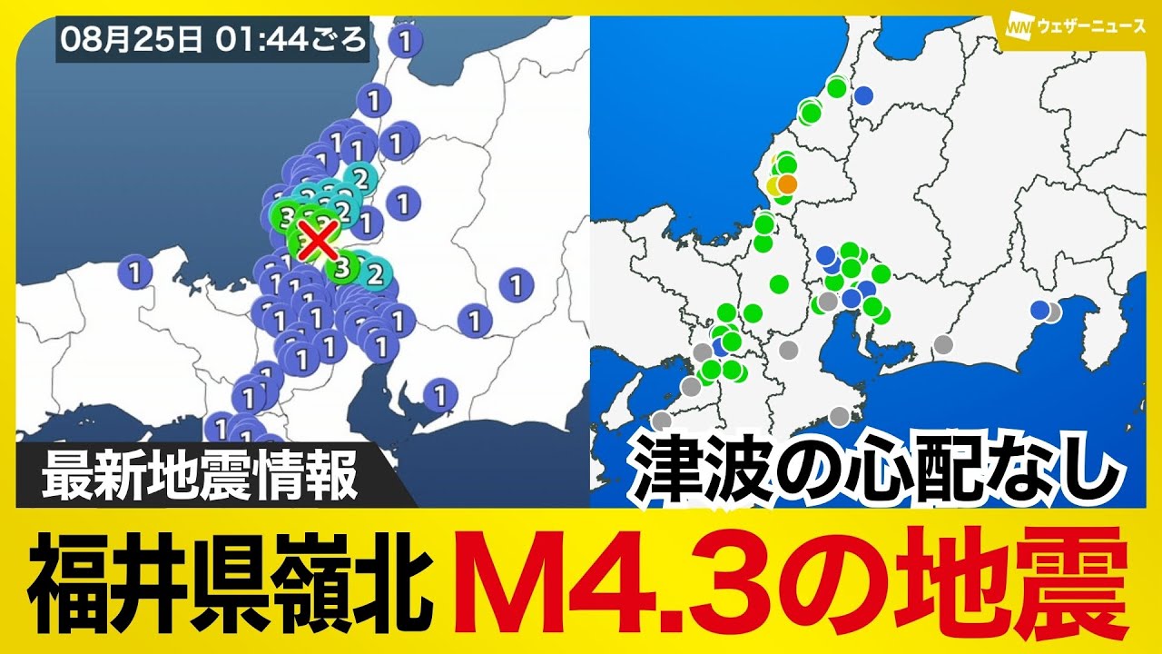 【地震情報】福井県嶺北でM4.3 福井県と岐阜県で震度3の地震 津波の心配なし