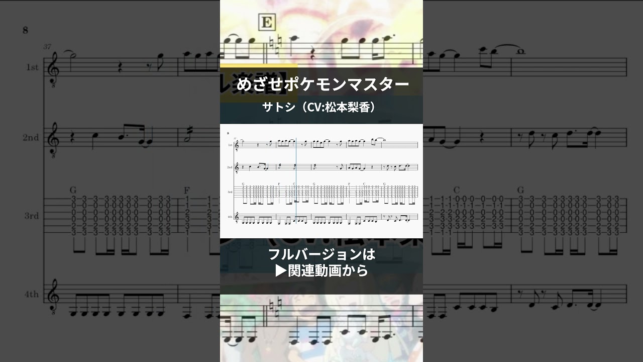 【楽譜】めざせポケモンマスター / サトシ(CV:松本梨香)【ギターアンサンブル】#shorts #楽譜 #ポケモン #ポケットモンスター #アニポケ #ギター #ギターアンサンブル #合奏 クラシックギター(プライム)のみのギターアンサンブル用に編曲した楽譜です。フルバージョンはこちらもしくは関連動画から ▼原曲 【公式】「めざせポケモンマスター -with my friends-」テレビアニメ「ポケットモンスター めざせポケモンマスター」新オープニングテーマ celebrity松本梨香