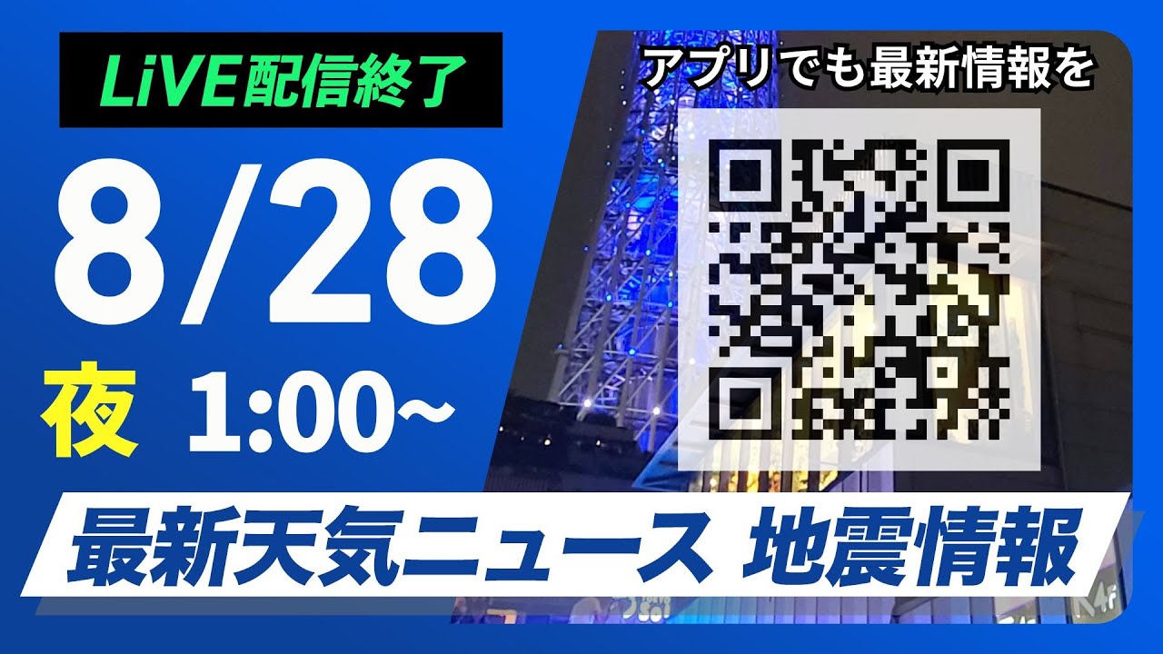 【ライブ配信終了】最新天気ニュース・地震情報 2025年8月28日(木) 1:00〜/関東は雲が広がり暑さ落ち着く 東海以西は猛暑日の所も〈ウェザーニュースLiVE〉