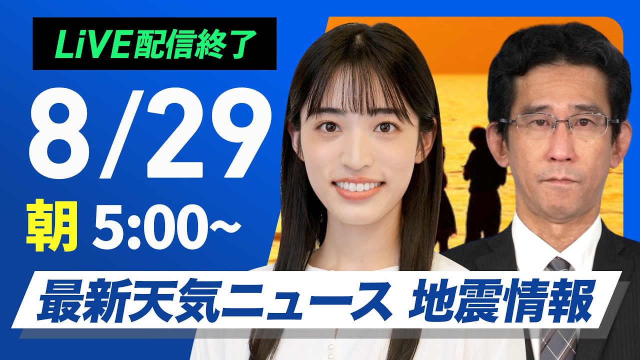 【ライブ配信終了】最新天気ニュース・地震情報 2025年8月29日(金)/西日本と東海の猛暑止まらず 北日本は夕方以降一部で雨に〈ウェザーニュースLiVEモーニング・松本真央/山口剛央〉