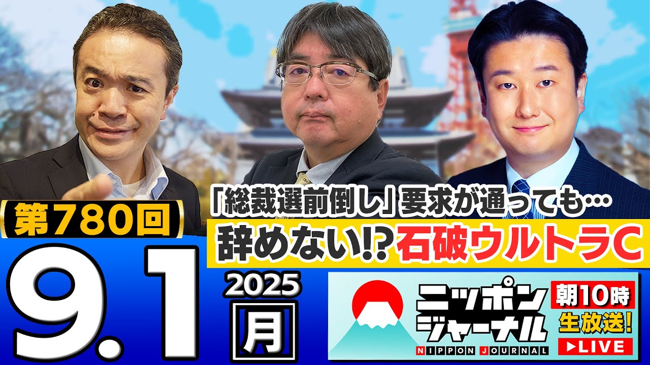 [音楽] 元気ですか?おはようございます。 9月1日の月曜日ね、え、東京蒲田の スタジオ本日もね、え、改正なりね、暑く 熱く激しく晴点なりといった天気になり そうですが、え、小中学生の皆さんはもう 夏休み終わりで今日から新学だったりする んじゃないですかね。ええ、気持ちを 引き締めて改めて、え、また新しい スタートということで、はい、頑張って ください。うん。え、そんな日本 ジャーナルでございますけど、またいだき 番組の本量をですね、え、月の初めから 発揮しておりまして、早速いだき物ご紹介 させていただきましょうね。ありがとう ございます。もう本と夜鍋でね、こごとく 有効活用させていただきたい。お茶の焼酎 ですよ。鹿児島のチラン茶。美味しいです もんね。もうね。はい。こちらもうボトル のデザインがまたこのおしゃれな感じでね 。え、そしてこのね、銘柄の名前がいいん だ。明るい脳。これは美味しいですよね。 私もね、え、しょっちゅあの頂いたこと ありますけども、これさ、さマ本格上ち 明るいノソン。これもういいんだ。これお 湯割りでもね、いけますしね。え、そして ね、密かなブームを呼んでいくという ボンタ雨。 こちらもね、え、頂いてしまいました。 それからね、甘いものもこのさま芋と最 さんのね、え、どしりと肖像がはい、鎮座 増しましております。から洋菓しさも タルトまで、え、ごになってしまいました ね。え、甘いものから辛いものまではい。 え、喜んでお受けする日本ジャーナル。 こちらね、あの、夜鍋、え、6日の土曜日 になりますけれども、伊東督をお迎えして のはい、宴の、え、花と添えさせて いただければと思っておりますので、え、 慎しんで頂戴します。ごちそうさでした。 さてさて、え、本日はですね、え、 3経経新聞社のアビルイさんと、え、全参議院議員の和田正宗さんをお迎えしてのお届けですが、早速チェック参りましょうか。どうぞ。ドン。はい。え、コニコの方ケートにはい。え、 [音楽] [音楽] YouTube でご視聴の皆様はコメント欄にね、番号をよろしくお願いします。ご 注目のどの話題になるか。まず自民、え、 7 つの健が総裁の前倒し要求岐阜は反対と、え、しかし半は未定ということですね。 [音楽] え、それから森山幹事長が石を牽制国民と 自民党の帰りを懸念。え、そして総裁戦 前通しはない。はあ。え、石総理の避難役 なんですか?この方がそんなに影響力ある んですかね?え、山崎の投しはそうだと いうことではい。え、一方、自民党の小林 高幸小さんは前倒し要求を牽制する衆議院 解散論を批判ね。え、解散しちゃえばいい じゃないかとおっしゃってるのは鈴木宗尾 さんなんですか。え、それから5番目、 これは例の上海協力機構でしたっけね。え 、集金兵士のはい。旗の元プーチン大統領 キムジョン委員長、そして、え、インドの モディ首相もね、え、はい。首脳会談が 次々と開催という集金ページとのという ことですが、え、野望という文字が劣って おりますけれども。はい。そして6番目、 え、NHKの戦後ドラマ。これは、え、 シミュレーションというドラマでしたよね 。昭和16年夏の配戦について比裂な軍人 に描かれたと、え、ご遺族の方が強い反発 、BPOへの低素もね、考えてらっしゃる というです。これは先週もちらっとお伝え したと思いますが、え、それから7番目、 急制仕様で不利益を受けたと答えた人、 企業の97%で、え、そんな不利益を込っ たケースはないよというね、回答が出たと いう意識調査のニュース。え、そして、え 、外面切り替え審査厳格化を10月開始 観光客は負荷というね、え、問題も ちゃんと難しくしてね、え、そして実致の 運転能力の検査もすべきだということで、 ま、これはもうどんどん、え、当然はい、 この方向で進めるべきでしょうね。そして 9番目、警備死亡のへのこダンプ事故義 女性書類双権へとうん。沖縄県の判断と いうことでね、これもやえないところ でしょうか。 さあ、え、高校のニュース項目上がっておりますけれども、皆さんのご注目。はい。え、関心の高さは?はい。 [音楽] YouTube9番。 YouTube9 番。うん。え、ニコ生はどうでしょうかね?ニコニコは数字出ますか?あ、出ましたね。ああ、ニコニコもね、 9番高いですね。うん。 9 番がじゃあ今日トップでいいましょうか。え、 [音楽] 1616 あたりもね。うん。 なかなかの数字になってますよね。ま、で も、え、今日のところは、え、ニコ生に はい。え、注目での高さは9番目の ニュースということでね、後ほどはい、 真っ先に触れていただきたいと思います。 え、それからですね、先週好評いただき ました、え、曜日横断のですね、企画。 今週も引き続き継続でやってまいりたいと 思います。はい。え、曜日横断、え、日本 ジャーナルコメンテーター意識調査で ございまして、先週はズバり石はいつ退人 するのかということでね、え、9月になる のか、それとも10月になるのか、 ある