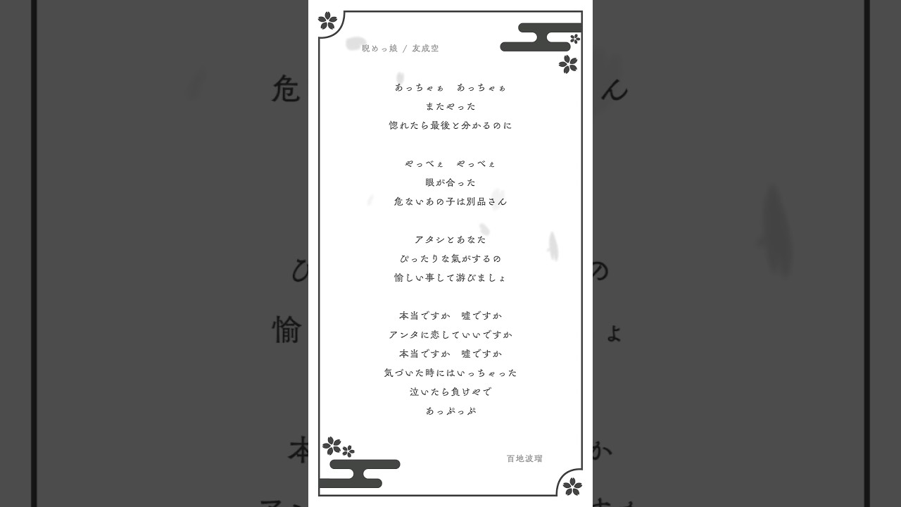 あっちゃ、あっちゃ、またやった。惚れ たら最後と分かるのに。やっべやっべ。目 があった。危ない。あの子は別っぴンさん 。私とあなたぴったりな気がするの。 楽しいことして遊びましょう。 本当ですか?嘘ですか?あんたに恋して いいですか?本当ですか?嘘ですか? 気づいた時には言っちゃった。泣いたら 負けやで。アッププ。