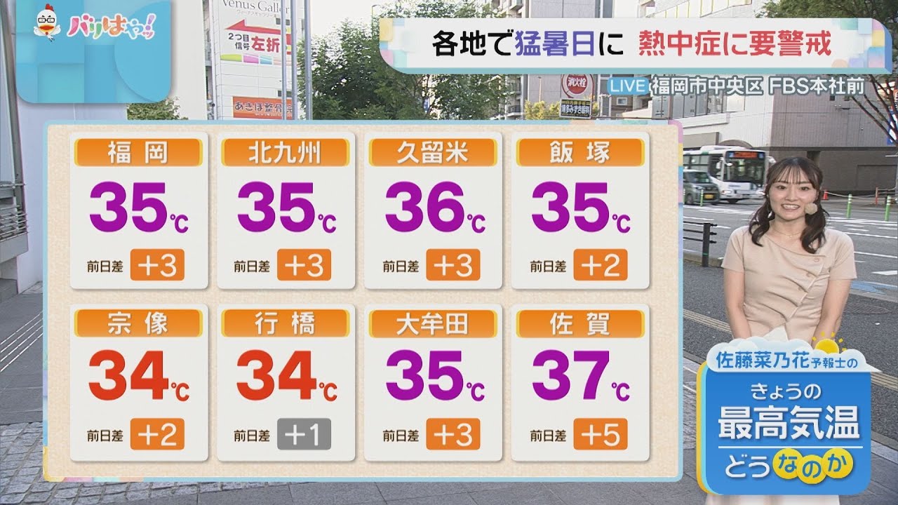 3日は各地で猛暑日の予想です。佐賀市では37℃まで上がる見込みです。佐賀市のこの時期の平年は31℃くらいですので、異例の暑さと言えます。最高気温は久留米市で36℃、福岡市、北九州市、飯塚市、大牟田市で35℃の予想です。福岡、佐賀ともに熱中症警戒アラートが発表されています。万全な対策をしてお過ごしください。