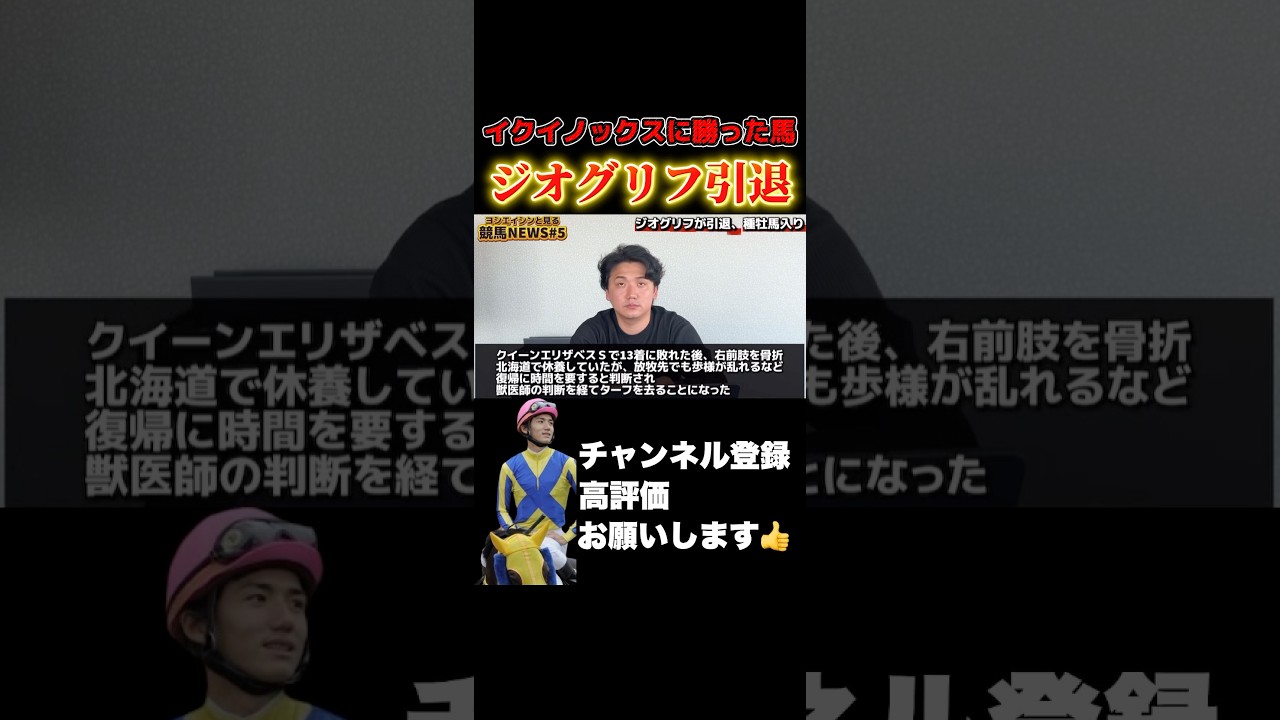 え、地獄リグが引退45 倍にということですね。え、クイーンエリザベス、クイーンエリゾベスステスステークスで 13 時に破れた後、え、骨折があったということで給容していたんですが、え、報先でも保用が乱れるなど一気に時間を要すると判断され、え、獣医士の判断を経てフをさることになったとは いうことでございます。 ま、Fノックスに勝ったよ うん。 ですからね。 はい。数少ない。 数少ない。同ジュースとこだけなんかな。 あの、さ木シでは同、この あ、そっか、そっか。 僕個人的には中山記念去年 ああ で32着か3着ねあだそうだそうだ 道船ジオグリフ そうだソローオリンス届か そう連ずつだったけどなんか持ってて [音楽] 100万ぐらい払いましたですね そうですね100万近かったですかね うんのですよかったですね そうですね うんまさ木商売ですからしってますからいい子をね排出してほしいなと ダートも走れますもんね。 あ、そうだね。ダートもね。うん。 楽しみです。はい。