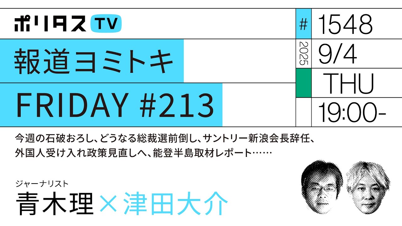 報道ヨミトキFRIDAY #213|今週の石破おろし、どうなる総裁選前倒し、サントリー新浪会長辞任、外国人受け入れ政策見直しへ、能登半島取材レポート……|ゲスト:青木理(9/4)#ポリタスTV