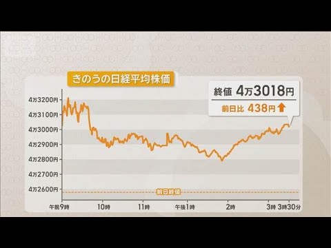 5日の日経平均株価は続伸し、600円以上、上昇する場面もありました。終値は、前の日より438円高い4万3018円でした。