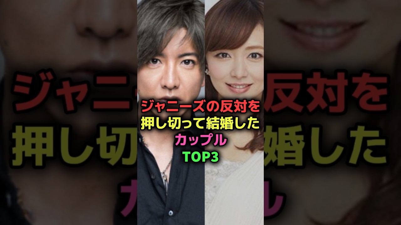 ジャニーズの反対を押し切って結婚した カップルトップ3第3位かずり伊藤彩子 2019年に元アナウンサーの伊藤子と 結婚を発表嵐の活動吸止直前での発表に ファンは大反発せめて活動が終わってから にして欲しかったという声が殺藤したが 結果的に結婚は認められたものの最も ファンに祝福されなかった結婚と言われて いた第2木村拓也工藤静か国民的スターと して絶長期にあった木村は工藤静の妊娠と 共に結婚を電撃発表事務所が強く反対した とされますが木村はやめても構わないで 言い切ったと報じられています。最終的に は事務所が折れる形で特例として認められ ました。第1位2011年に不倫疑枠が 報じられ当時相手はまだ全府と婚姻中そこ から略奪のイメージが強くつきまといまし た。事務所も距離を受けと言ったとされ ますが彼は同日交裁を継続。そして 2017年ついに結婚を発表。 スキャンダルを超え俳優としての信頼を 積み重ねた結果、事務所も正式に認めざる を得なかった。 [音楽]