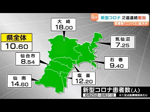 新たな変異株「ニンバス」感染拡大も影響しているとみられていて、宮城県は、感染対策を徹底するよう呼びかけています。宮城県によりますと、8月31日までの1週間に宮城県内55の定点医療機関で新型コロナと診断された人の数は583人と前の週に比べ30人増えました。