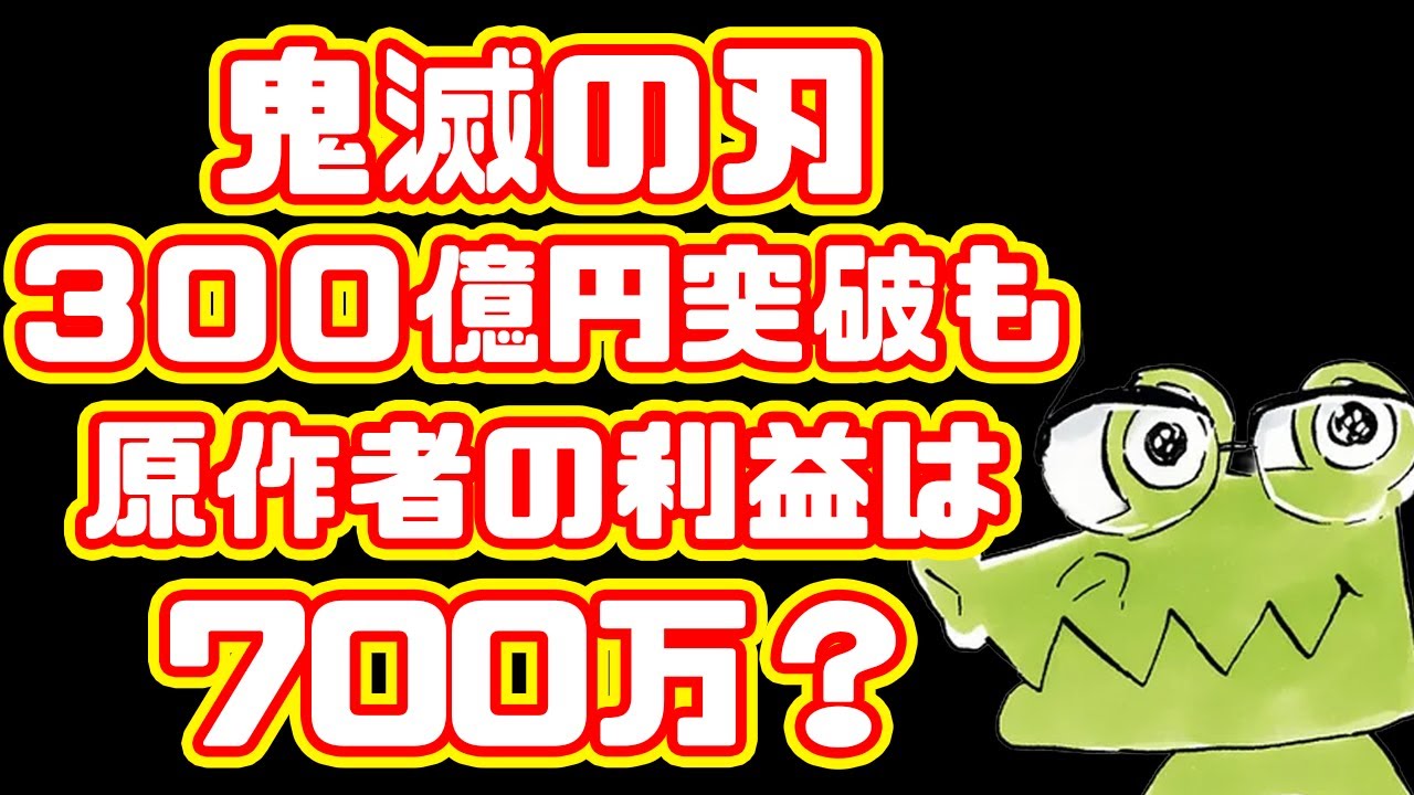 どうも皆さん。今回は鬼滅の刃についてだよ。 いや、300億円行ったな。 工業収入が300 億円突破して、まだまだ勢いは止まらない感じだね。 とりあえずりさんの予想は当たった感じか。 400 億円は無理じゃないかなと思ってるんだけどね。 3部作で合計1000 億円っていうのがなんとなく切りがいいなと思ってるんだけど、 まだまだこれから伸びる可能性もありますけどね。 そんな300 億円という数字のインパクトは凄まじいんだけど、同時に原作者はいくら儲かってるのかっていうのは気になるところではあると思うんだ。ああ、確かに 300億円なんて全代門やもんな。 1%って考えても3億すご。 そういう風に想像する人も多いと思うんだけど映画における者の利益って固定されてるんだ。 ええ、 映画が大ヒットしようが大ヒットしまいが工業収入がいくらでも原作者に対する一時使用量と呼ばれるものは最大で 1000 万円ってのがルールとして決まってるんだ。 夏すぎる。 ちなみに1000 万もらっても出版社がそこから 3割くらいは持ってくよ。 え、つまり五藤よ春先生はも儲かっても 700万円ってこと。 あくまで今回の映画家に伴利益はそうだね。 マックスが1000 万円ってだけで実際は数百万 程度、100万から500 万くらいが相場みたいだよ。 嘘やん。350 万くらいしか設けてないんか。 これさ、鬼滅の刃と関係なくちょっと Twitter の方でも話題になっててさ、とある人がアニメ家に当たって原作者には 100万から250 万円しか入らないって話題になってたんだ。 少ないな。 これも一時使用量の話だね。あくまでもあなたの作品を映画化させてください。 あなたの作品をテレビアニメ化させてくださいっていう契約に伴う利益が数百万ってことなんだ。 原作を使って孫悟後移収入を得てるのに原作者への還元が少なすぎないですかね。 これ無限列車編の時も言われてたんだよね。ただ勘違いしないで欲しい。これはあくまで一時量なんだ。 さっきから言ってますね。 あくまで原作者に映像化するための権利に対する使用量なんだ。だから同時に映画やめが大赤字でも原作者がその赤字を補填する必要はないんだ。 なるほど。リスクはないんやな。 映像がヒットすれば必然的に原作も売れる。それに伴利益の増加はもちろんあるんだけど、さらに 2次使用量ってのがあるんだ。 お2が出てきた。 これが何かって言うと例えば円盤が分かりやすい。円盤が 1枚8000円だとしてそのうちの数% の利益が原作者にも2 次使用量という形で入るみたいな感じなんだ。 [音楽] おお、それめっちゃでかいんやない? でかい。特にここ最近は配信サイトの影響がすごい大きいんだ。 複数の配信サイトでの配信が決まった段階である程度制作費はペできてる状態になるくらい配信サイトの存在はでかい。 1 サイトあたり1000万だとして10 サイトで1億やもんな。 実際は国内の配信サイトかアジア県の配信サイトかアメリカとかの配信サイトなのかで配信量のつきはあるんだけどね。この辺りは以前も動画にしたんだけど国内は安い、アジアはちょっと高い、アメリカは高いって感じなんだ。 [音楽] その配信量のうちの何%センかも原作者にはいるわけか。 うん。他にもテレビで放送されたりしても入ってくるし、大ヒットした映画なら配信サイトでも配信されるし、配信量も上がる、テレビでも放送されるし、円盤も売れる。 ああ、財布が潤っていく。 グッズの儲けとかもあるからね。もうはうはですよ。 [音楽] 鬼滅の刃とかほんまとんでもないことになってますし。 どんくらい設けてるんやろうな。 今回の無限上編における原作者の儲けは 多く見積もっても350万くらいで工業 収入は一切関係ないけど原作者への利益 還元があるのはここから後なんだ。工業 収入がいくらすごくても原作者には数百万 しか入らないのは確かではあるんやけど そこだけに着目してニュースサイトとか SNSとかまとめサイトが飛ばし記事やっ てるんやろうな。まあ見出しとして キャッチーではあるからね。工業収入 300億円でも作者には300万円とかさ に行っちゃうわな。 だ、これあくまで一般的な話なんだ。全ては契約なんだ。一般的には今まで行ってきた感じのが普通なんだけど、鬼滅の刃は一般的ではない。 草。違う契約結んでる可能性もあるんか。 うん。だって無限列車編はあれだけヒットしたでしょ。で、すでに原作は完結済み。原作者がどれだけ儲かってるのかは想像できないくらい儲かってる となると逆にとんでもなく強気にも出れるよな。 無限からの映画は工業収入の [音楽] 1%ください。 そういう契約じゃないと映画家の許可を出しません。そういう風に言えちゃうのも原作者という立場なんだ。 そういう可能性もあるってことですよね。契約書の内容が一般的なものなのか。はたまた今回の映画から強気に出た契約になってる可能性も否めない。 そういう契約になったところで収営者とかも全然ええもんな。 原作使用量、一時使用量だって無限列車編の時は 500 万