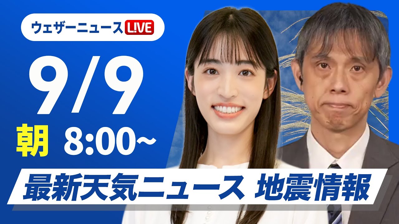 【ライブ】最新天気ニュース・地震情報 2025年9月9日(火)/西日本や東日本は残暑と天気急変注意 日本海側は広く雨〈ウェザーニュースLiVEサンシャイン・松本真央/芳野達郎〉